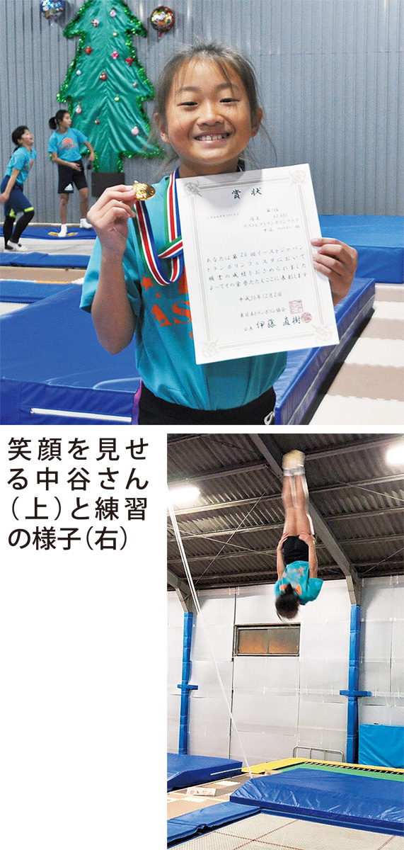 アストレアスポーツクラブ(海老名)に所属する柳島小学校3年の中谷ののかさんが12月2日、福島県で開催された「第26回イーストジャパントランポリンフェスタ」の個人競技小学校低学年クラス女子で優勝した。