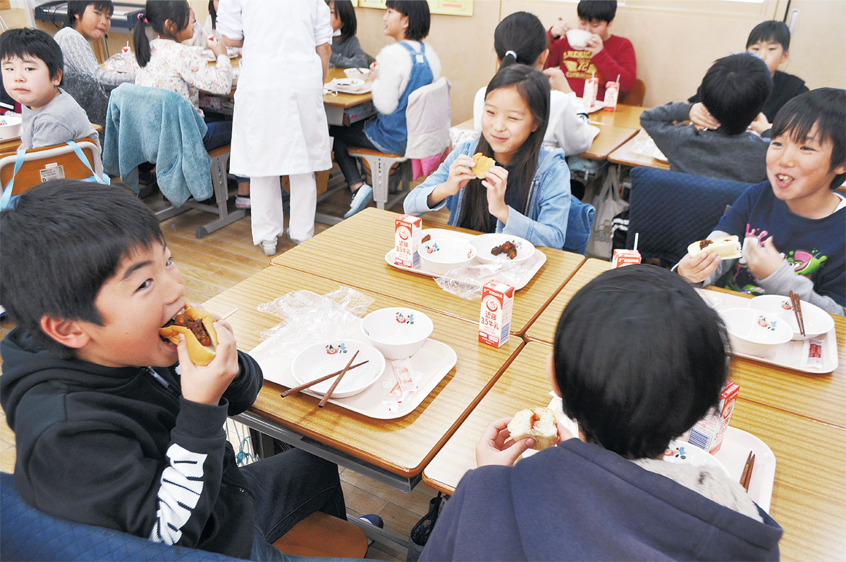年に一度だけのクジラを食べる機会に、パンで竜田揚げを挟んで食べるなど児童たちは大盛り上がり。竜田揚げを食べた小林奏羽(そう)君(4年)は「ごはんとも食べてみたい」と話し、尾崎永遠さん(同)は「硬さがちょうどよくておいしい」と笑みをこぼした。