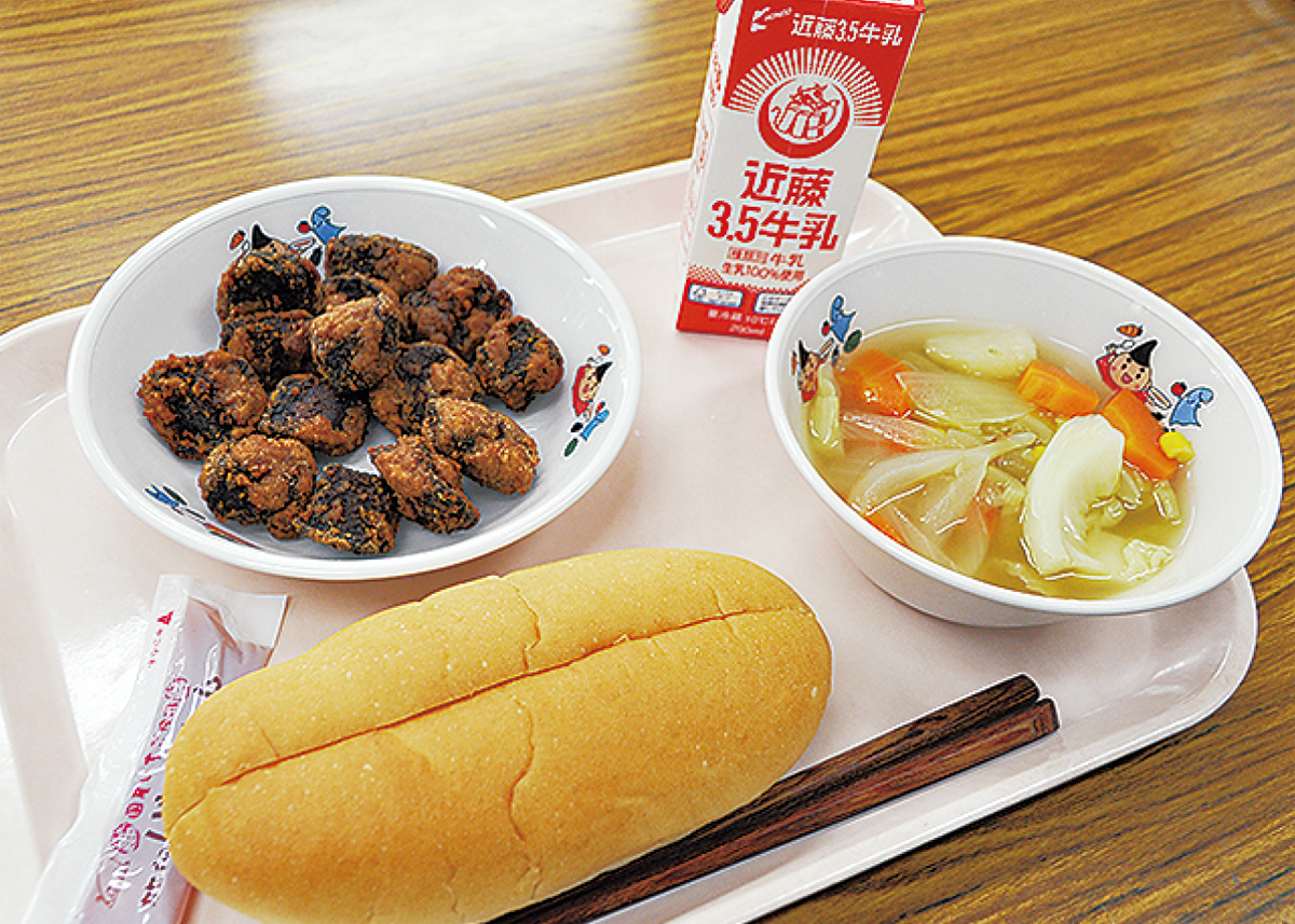 先月末に行われた全国学校給食週間に合わせて、1月22日に鶴嶺小学校でクジラ肉を使った給食が提供された。献立はクジラの竜田揚げ、野菜たっぷりのカントリースープ、パン、牛乳。