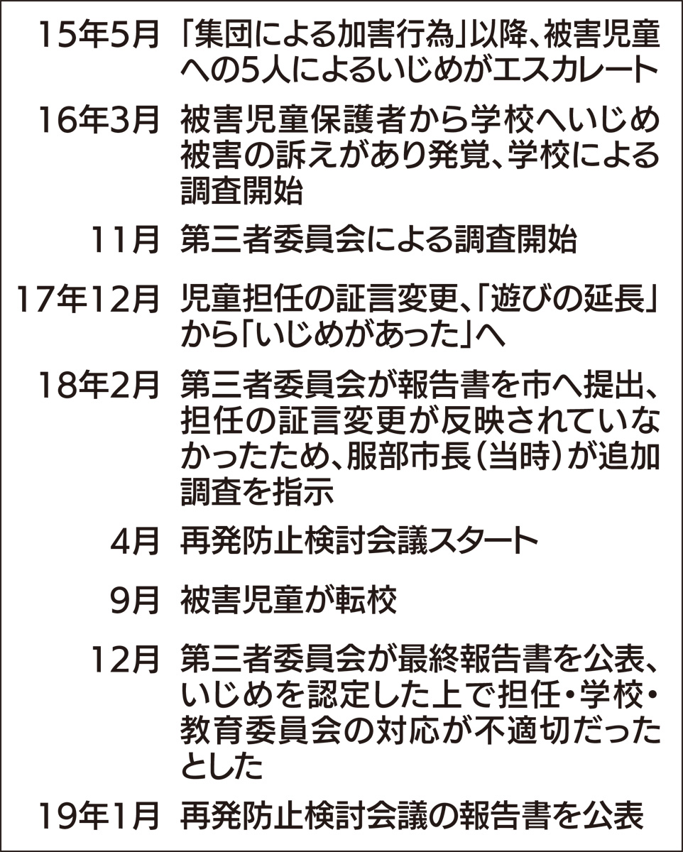 いじめ認知後、学校が加害児童5人を中心に聞き取り調査を進めるも進展が見られず、被害児童の保護者からの訴えによって大学講師や精神科医らで構成する第三者委員会が16年11月から調査を開始。調査中の17年12月には、学校から担任への聞き取りで「単なる遊びの延長」から「いじめはあったが見過ごそうとしていた」と証言を翻したにも関わらず、報告を受けた教育委員会から第三者委員会へは口頭のみで伝え、15点中12点の資料が提出されず。18年2月に第三者委員会がまとめた報告書にも反映されなかった。
