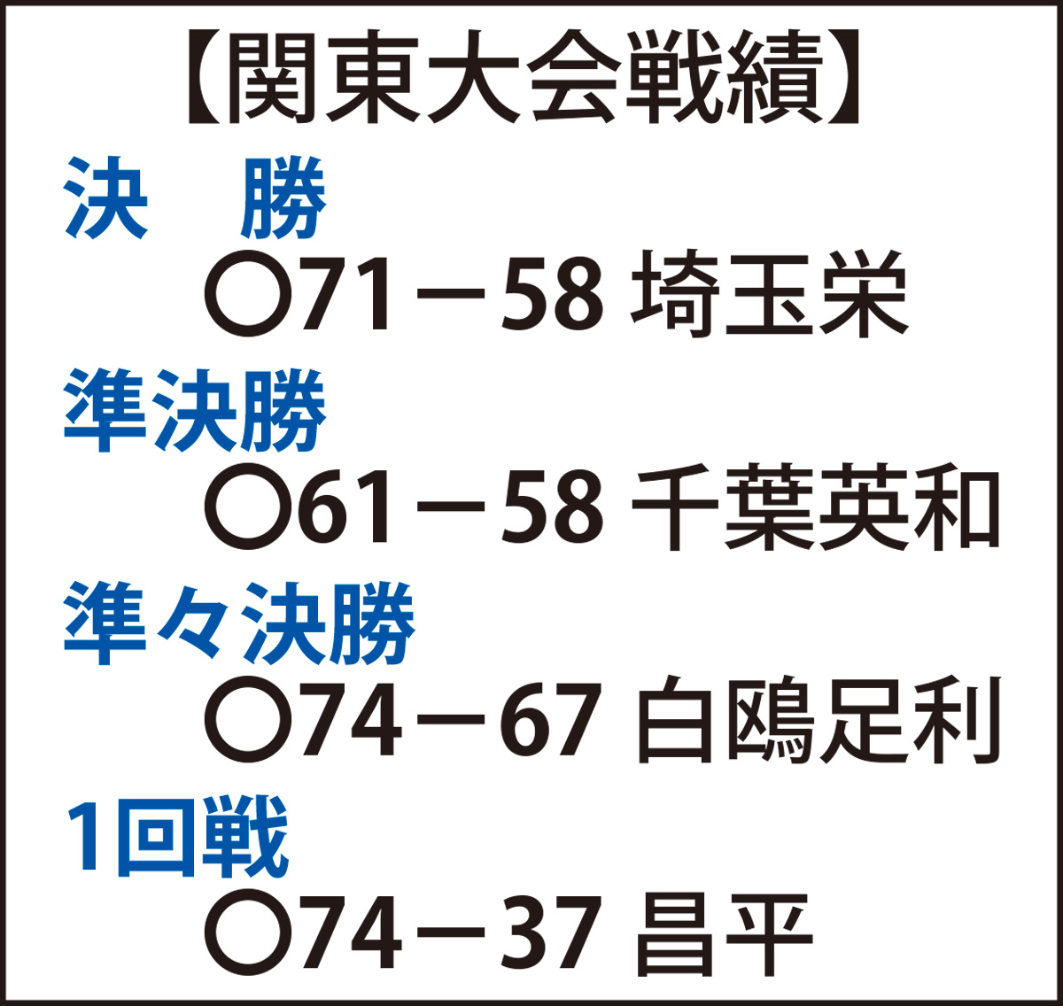 続く関東では、1回戦で昌平高(埼玉)、準々決勝で白鴎大学足利高(栃木)に勝利。準決勝の千葉英和高(千葉)との一戦は、最大10点のリードを奪われるなど終始追いかける展開に。終盤にじわりじわりと点差を詰めて1点差となったところで、「諦めが悪い」という古木梨子主将(2年)の3ポイントシュートが決まって逆転。最後は3点差で逃げ切った。勢いそのままに決勝の埼玉栄高(埼玉)も破り、初の関東女王の座に就いた。古木主将は「勝ったのは奇跡すぎてよくわからないけど、うれしいです」と喜んだ。