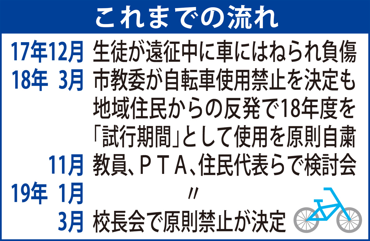2017年12月、自転車に乗って部活の遠征中だった生徒が車にはねられ重傷を負ったのを機に、市教育委員会は18年4月以降の自転車使用を全面禁止する方針を決定した。