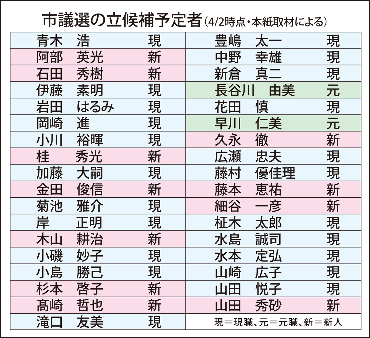 定数28に対し、本紙取材に対して出馬の意向を明らかにしているのは、現職22人、元職2人、新人11人の計35人=表参照。立候補を届出する14日の告示まで人数は前後する可能性があるが、定数を優に上回る見通し。返り咲きを目指す元職2人に加え、新人には昨年11月の市長選や市議補欠選挙の立候補者も再び議席を狙う。