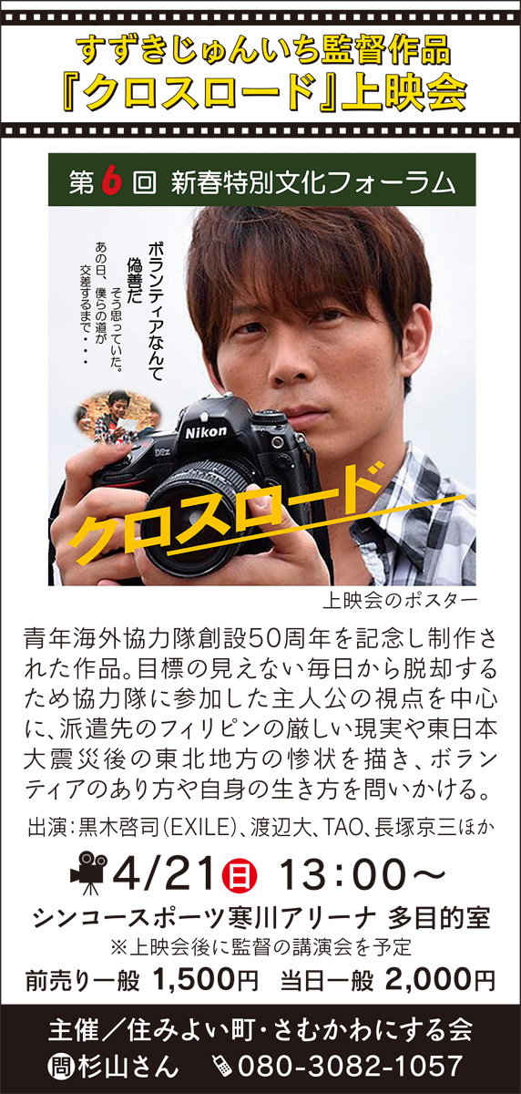 下積み時代を経て、29歳で監督に。その直後、縁あり青年海外協力隊の隊員としてモロッコに赴任。映画監督として、現地で教育映画を作る指導をした。その時の経験も手伝い、2015年には同協力隊創設50周年記念映画『クロスロード』の監督を務めた。4月21日(日)には、寒川町で上映会が企画されており、その後の講演会に登壇予定。「裏話とかもお話できれば」とすずき氏は笑顔を見せた。