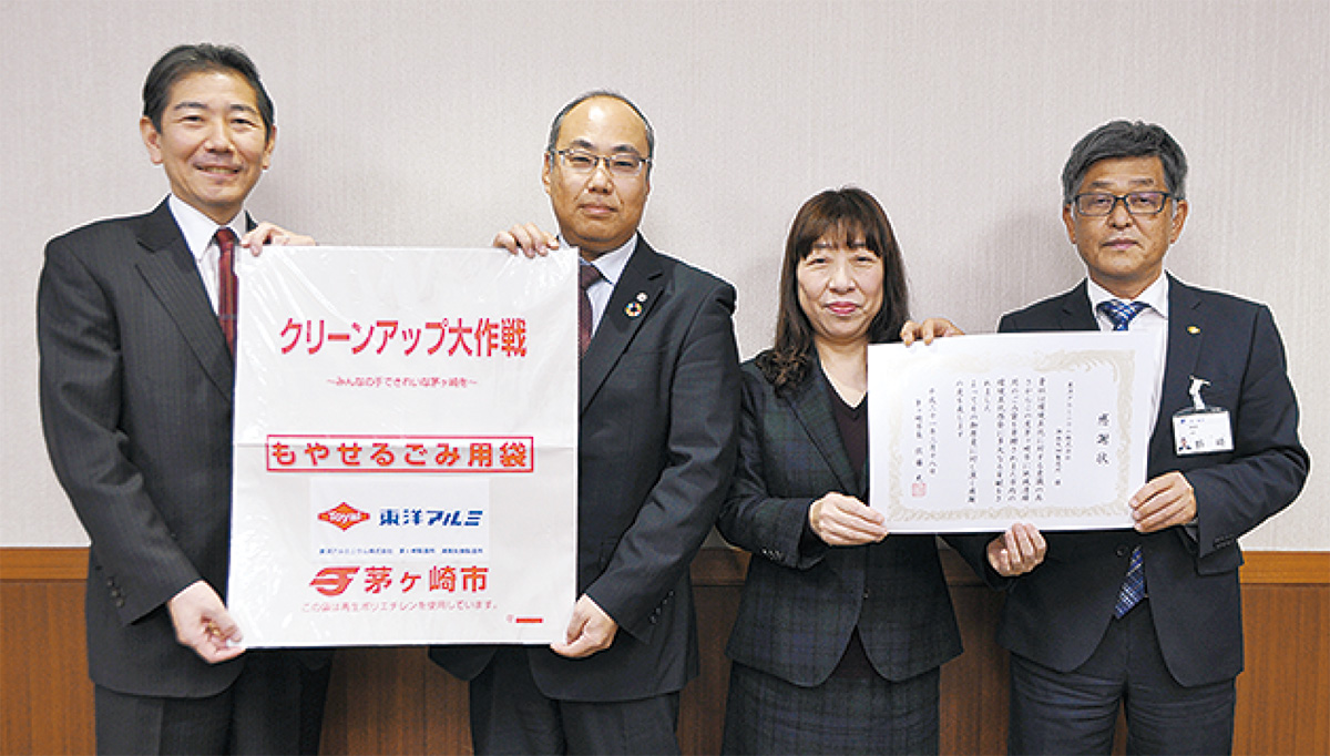 東洋アルミニウム(株)湘南矢畑製造所(矢畑)の江頭喜代二所長らが3月18日、茅ヶ崎市役所を訪れ、同社ロゴ入りのごみ袋の寄贈式が開かれた。寄贈されたごみ袋8100枚は地域清掃ボランティアなどで活用される。