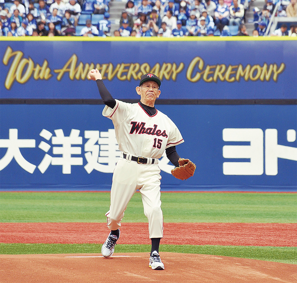 球団史上最多のシーズン26勝を挙げた元・大洋ホエールズの稲川誠さん(東海岸南在住・82歳)が4月14日、横浜スタジアムで行われたプロ野球公式戦「DeNA対広島」の試合前に始球式を務めた。
