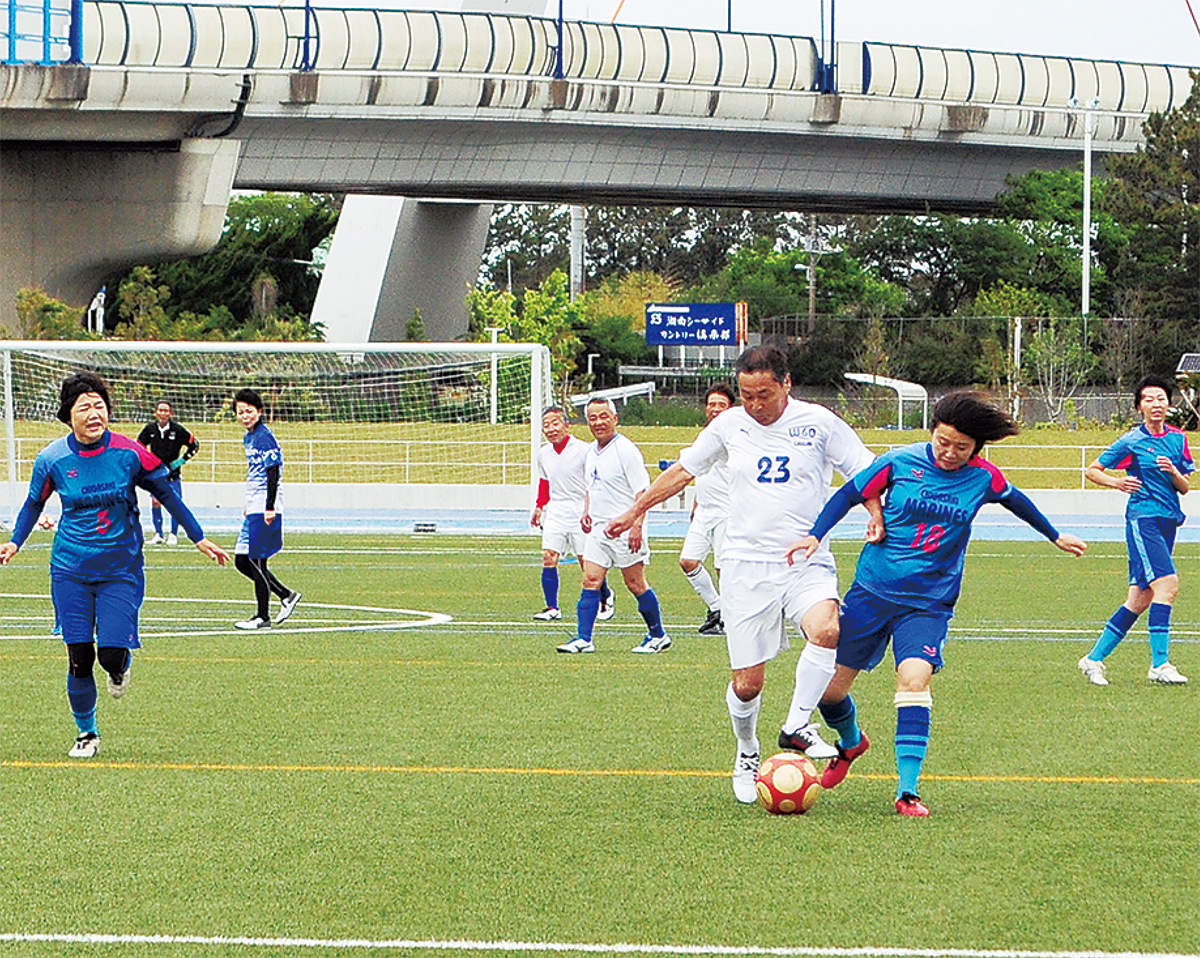 今年は、俊足でテクニックも併せ持つメンバーが一員に加わった。「優勝を狙えるチームに仕上がっている」とメンバーが口を揃えるなか、市内で活動するレディースサッカーチーム『茅ヶ崎マリンズ』との、ねんりんぴっくへの壮行試合が5月9日、柳島スポーツ公園で開催された。