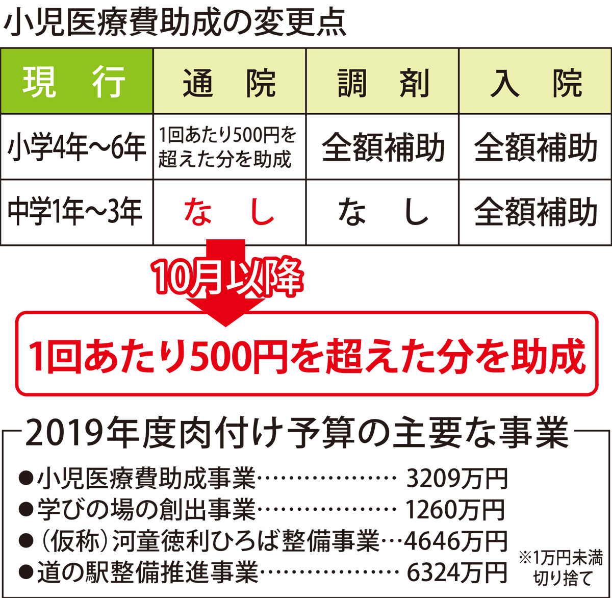 今回の施政方針では、今年10月を目途に通院の助成対象を中学3年生まで拡大し、1回の通院につき500円を上限として自己負担額を設定した。子育て家庭の経済的負担の軽減と、安心して子育てができる環境づくりを図る。