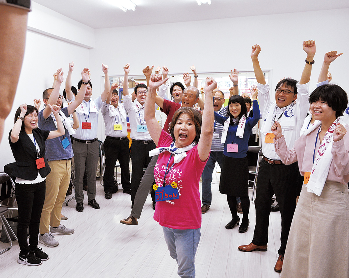 当日は中川みず江さんらクラブのメンバーが講師を務め、ラフターヨガのポイントを解説。参加者はささいなことでも笑いに変える方法のほか、手拍子やかけ声を実践し、首から提げたニックネームを呼び合いながら交流を深めた。