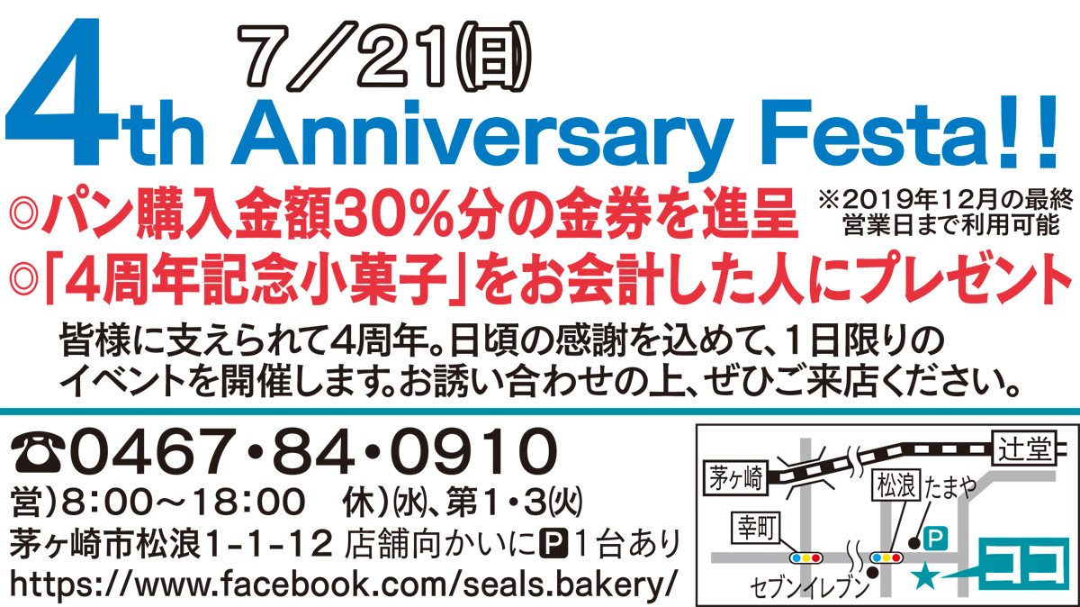 80種のパンが並ぶ「SEALS BAKERY」で7月21日(日)午前8時から、4周年記念フェスタが開催される。当日は、購入金額の30%分の金券や、小菓子がもらえる。