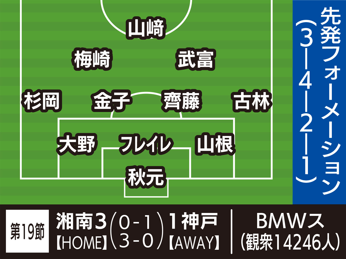 湘南ベルマーレは7月14日、ホームでヴィッセル神戸に3対1で勝利した。ホームでは3月17日の仙台戦以来の白星で、今季2度目の2連勝となった。