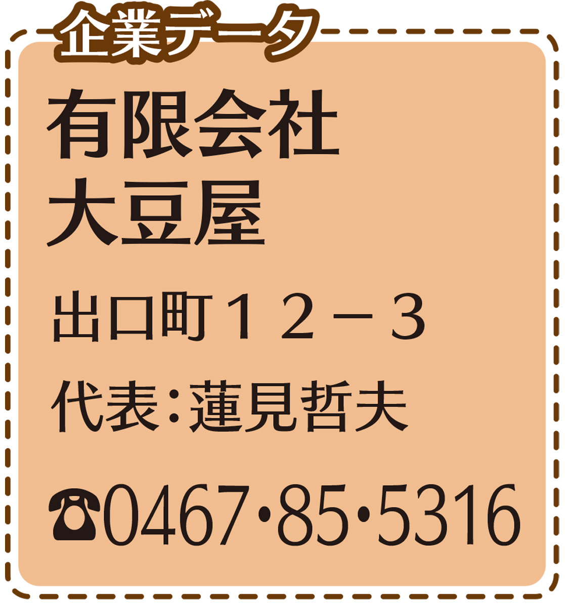 豆腐、油揚げなど大豆製品の製造販売を行い、約31年となる。代表取締役の蓮見哲夫さんが、湘南台の栗原商店で購入した豆腐の味に衝撃を受け、3年の修業の後1986年に独立、創業を開始した。