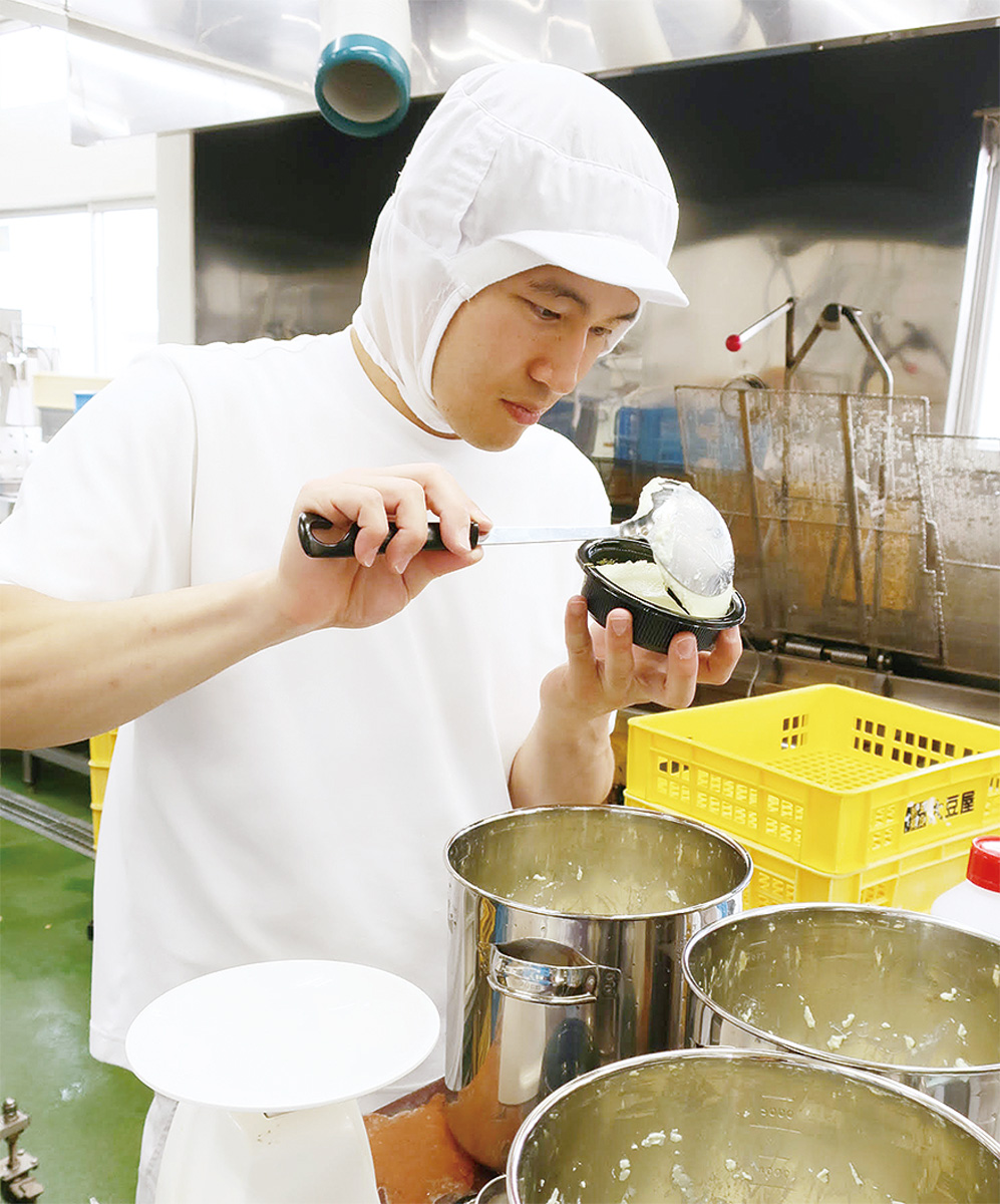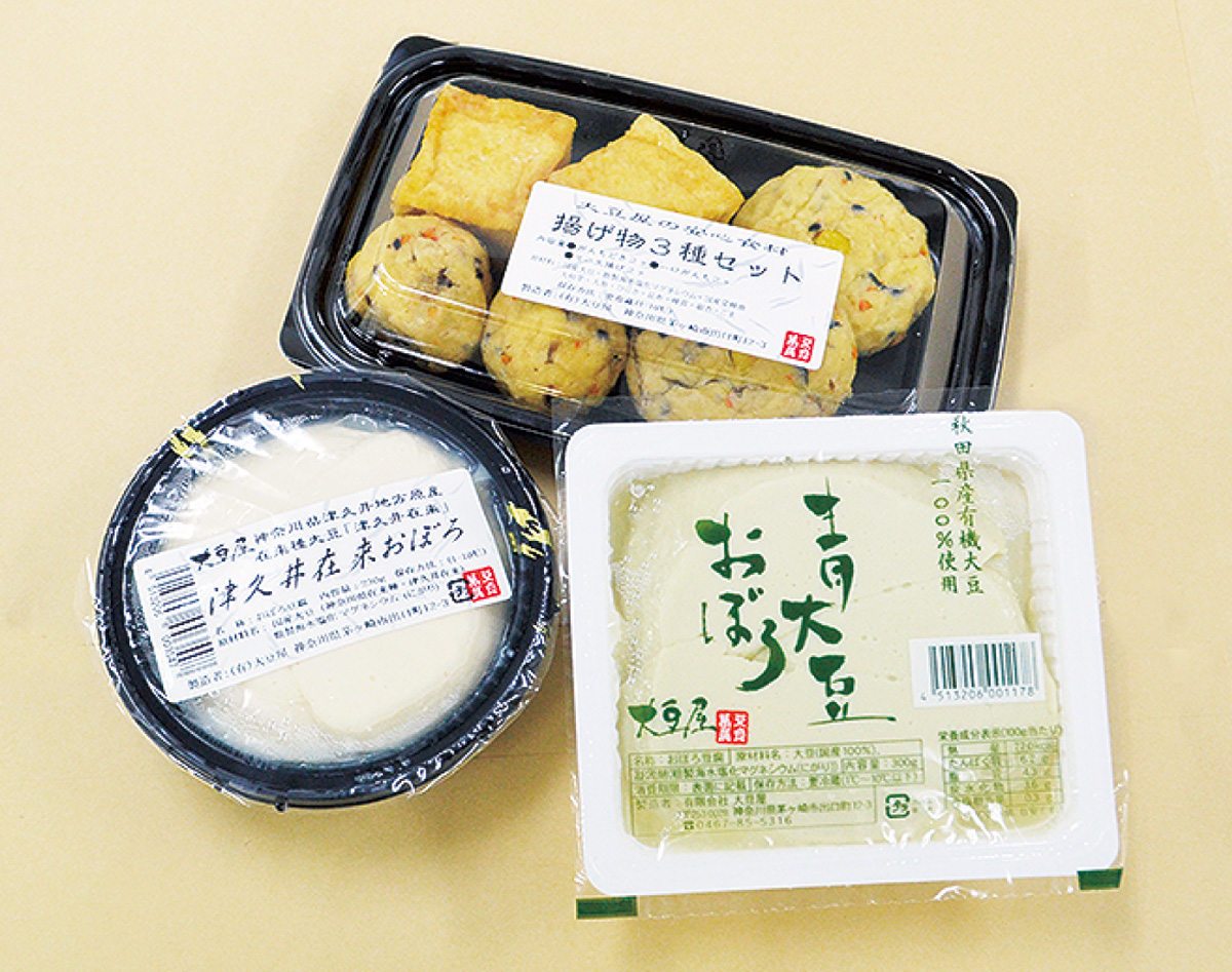 社員は約15人。今年に入り、2代目を受け継ぐ大久保貴章さんが東京の豆腐工房から新たに加わった。毎朝4時には作業開始。大豆約1・5俵を仕込み終える頃には午後2時を回る。定番は神奈川県地産地消の津久井在来汲み上げ豆腐。舌触りがよく、濃厚で雑味のない大豆本来の甘さが人気だ。近年はヴィーガンやダイエットブームなどで若い女性の購入者が増え、イベント出張販売や、インターネット販売も盛ん。一方で、一番の購入者は地元来店客。開店以来31年のファンも。「味は嘘をつかない。食べた人が驚く豆腐を作りたい」と笑顔を見せた。