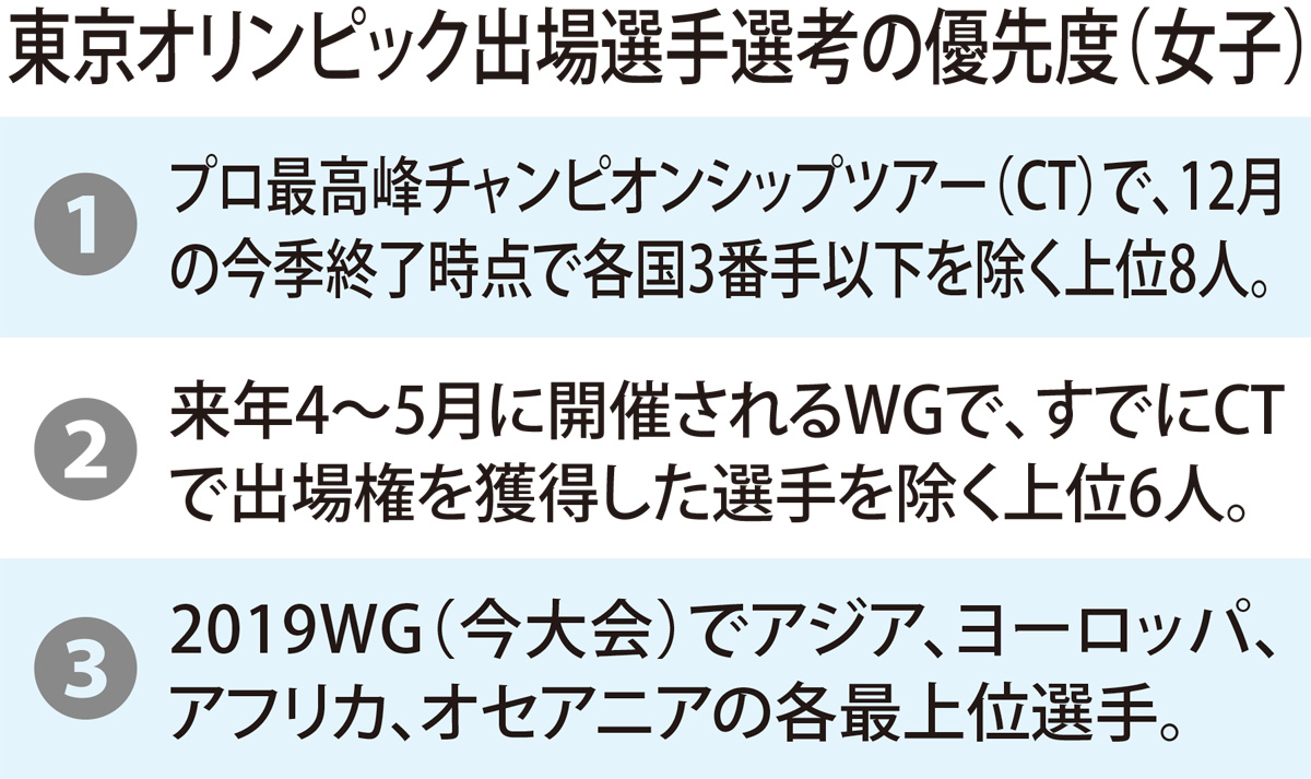 東京五輪の女子出場枠は最大で2人。選手選考の優先順位(別表参照)があり、松田さんの出場が最終的に確定するのは、松田さんも出場する来年4〜5月に開催されるWGの結果を待ってからとなる。このWGで松田さん以外の日本勢2人以上が6位以内に入らなければ、五輪代表に決まる。