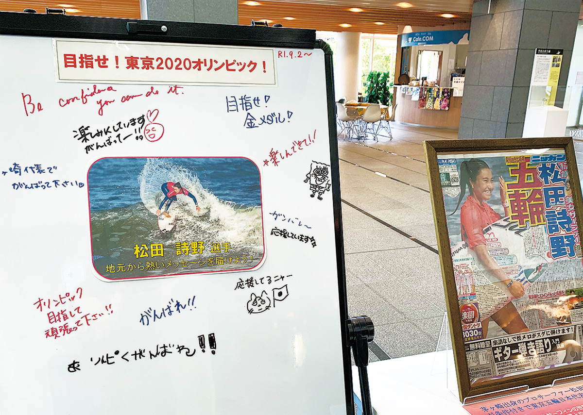 松田さんを後押ししようと、市役所本庁舎1階に応援パネルが設置されている。メッセージを書き込むことが可能で、書かれた言葉は関係者を通して松田さんへ届けられる。設置期間は来夏までの予定。関係者は「市をあげて盛り上げていければ。ぜひメッセージを書きにきて」と話した。