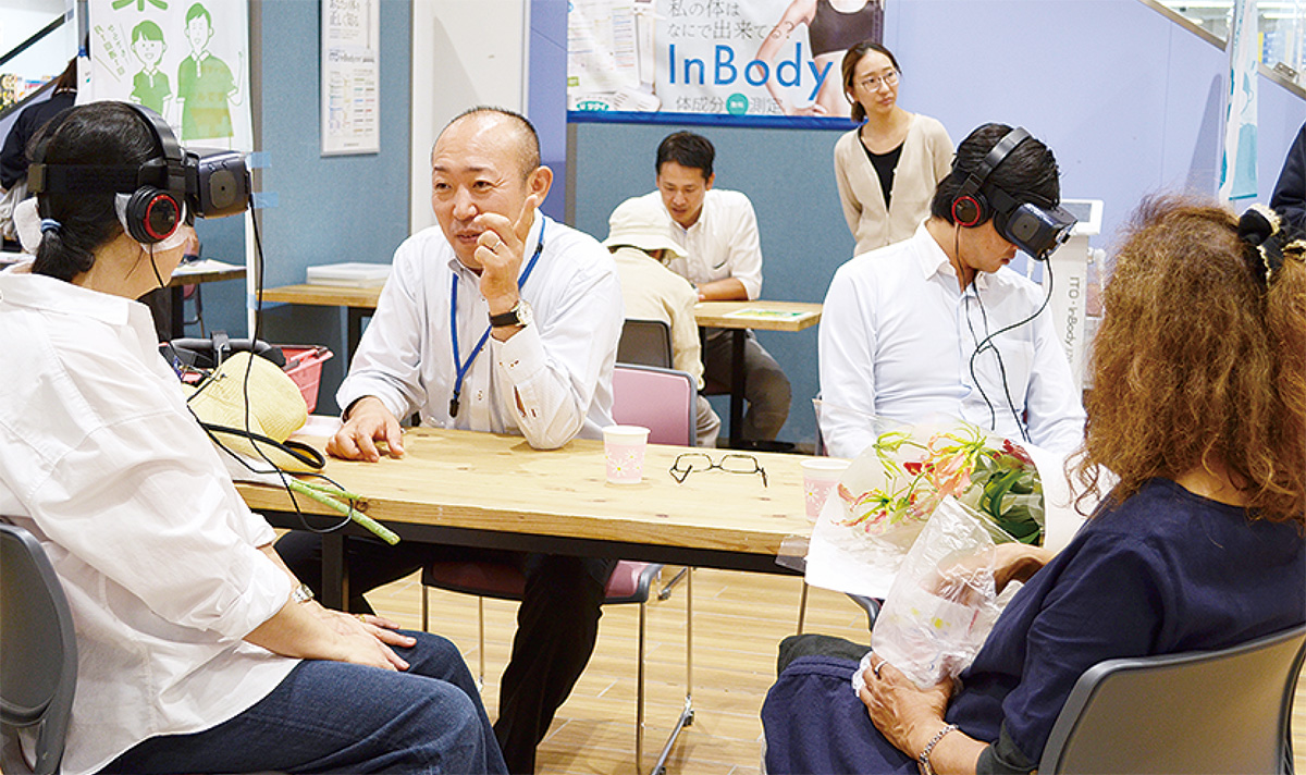 5回目となった今回は、介護相談や、介護業界の仕事の内容説明に加えて、ゴーグルを装着すると限りなく現実に近い世界に没入する感覚を得られる仮想現実(VR)体験ブースを用意。幻聴や幻視がみられるレビー小体型認知症や認知症の人が感じる不安を、来場者たちが体験した。