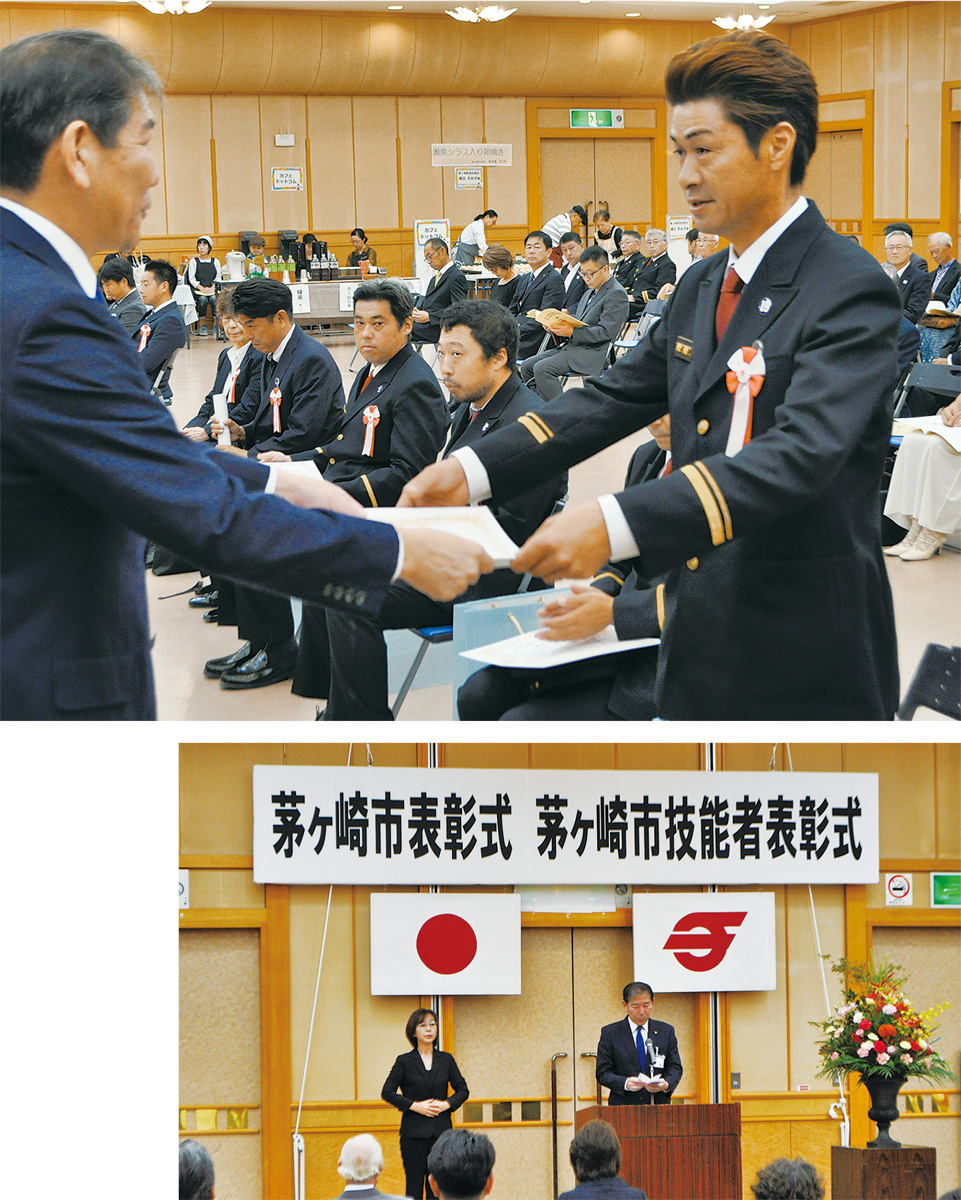 市役所分庁舎6階コミュニティホールで10月1日、茅ヶ崎市表彰式・技能者表彰式が開催された。これは市政の発展に貢献しさまざまな分野で優れた技能や技術を発揮した人たちを表彰するもの。