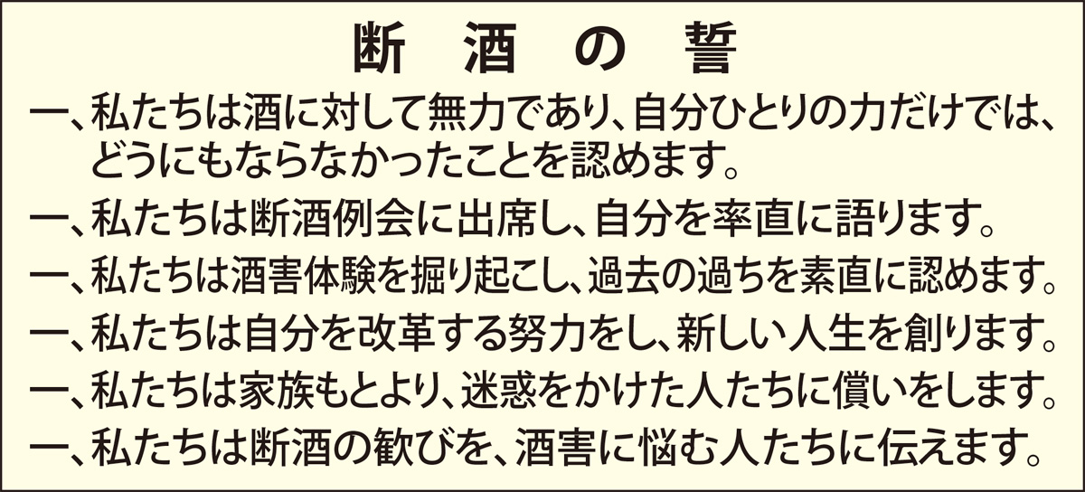 「断酒会」とは、アルコールの過剰摂取で体を壊したり、事故や事件などを起こしてしまった本人やその家族が入会している自助組織で、全国の会員数は約6000人と言われている。「断酒例会」と呼ばれる集会に出席し、会員一人一人が酒害体験や自身の思いを素直に語り、聴き、互いを支えあいながら問題解決に努めていく。