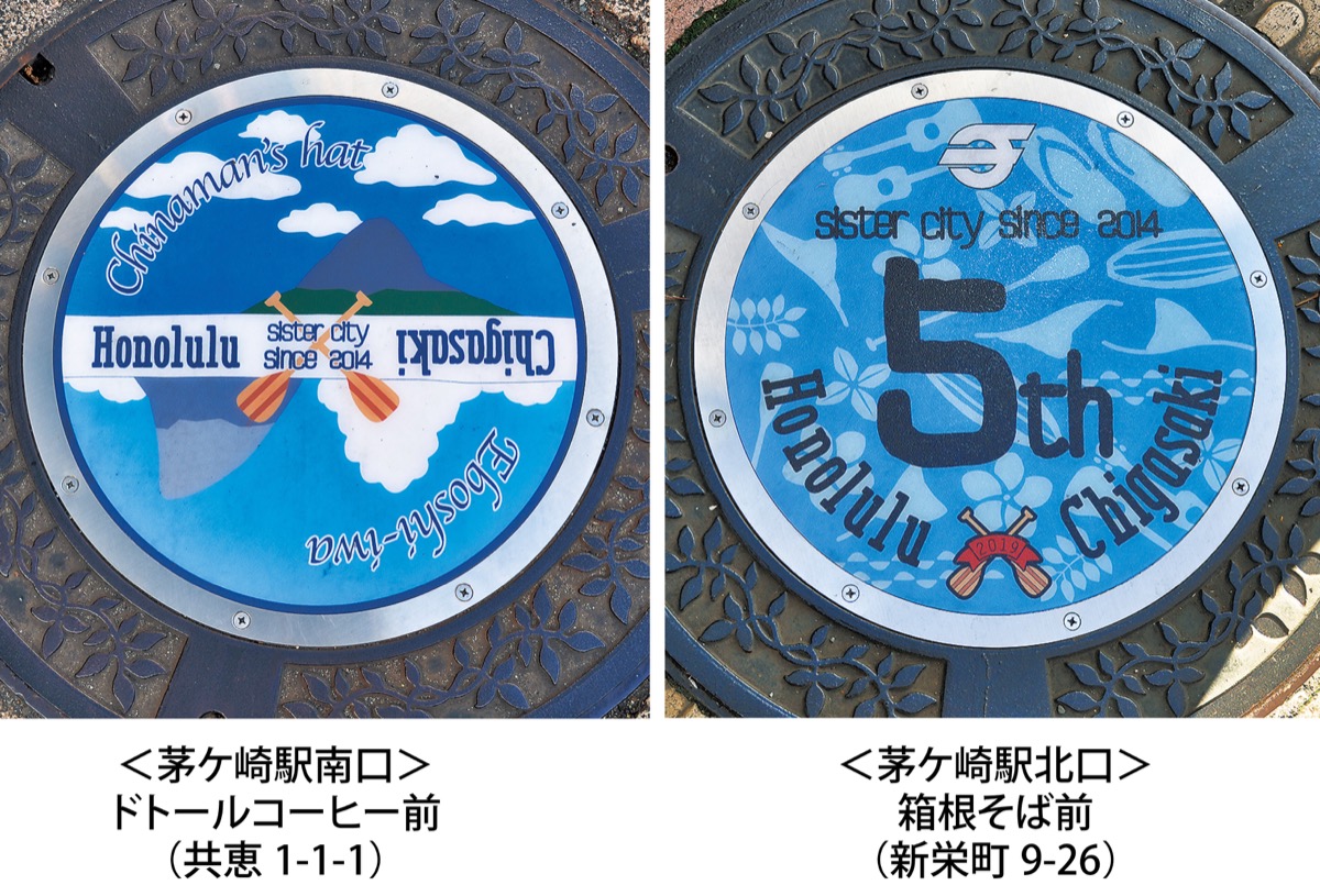 茅ヶ崎市内では、3カ所にデザインマンホール蓋を使用。そのうちの2カ所を、これまでのえぼし麻呂からホノルル仕様にリニューアルした。デザインは(株)星美製作所(下町屋)が担当。南口には両市のシンボルのえぼし岩、チャイナマンズ・ハットが青空とともに描かれ、北口はアロハシャツのイメージで製作された。茅ヶ崎市下水道河川部は「デザインマンホールを通じて下水道に関心を深めてもらえれば」と期待を寄せた。