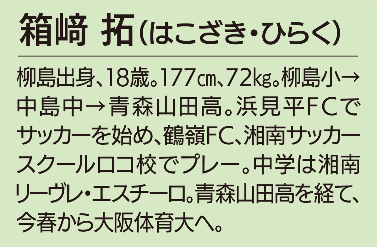 今や名実ともに高校サッカー界のトップに君臨する青森山田高校で、レギュラーを掴み取った茅ヶ崎出身の選手がいる。その名は「箱崎拓」。中学時代まで無名だったディフェンダーは強豪校で努力を重ね、3年生になった今季、花を咲かせた。