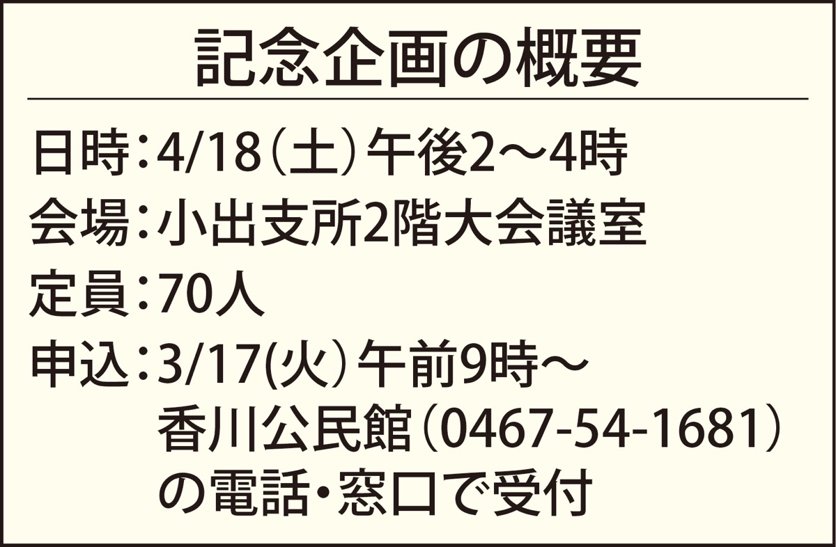 4月18日のイベントは午後2時から4時まで。山田耕筰が作った曲のほかに、加山雄三さんなど茅ヶ崎ゆかりの曲も歌う。参加無料。申し込み・問い合わせは香川公民館【電話】0467・54・1681へ。新型コロナウイルスの影響で、開催日に小出支所が閉館している場合は延期の予定。