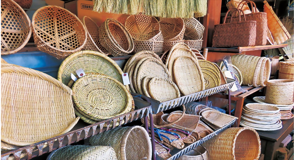 昔ながらの木製の格子戸の向こう側に所狭しと並ぶ、竹細工のザルや籠たち―。ガラス越しに見ても、実用性と素材の美しさを兼ね備えている品だということが分かる。