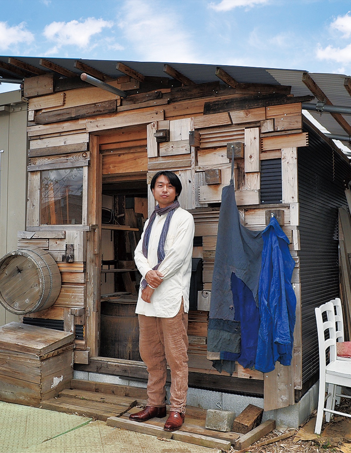 文教大学を卒業後、主にWebで古物商を営む佐野さん。「ありがたいことに藍づくりでは人の縁に恵まれた」。柳島海岸の川村眞弓さんが土地を無償で貸してくれたほか、工房づくりにも全面協力。隣の畑の大工さんも手伝ってくれた。廃材も市内の建設業者から譲り受けたものだ。
