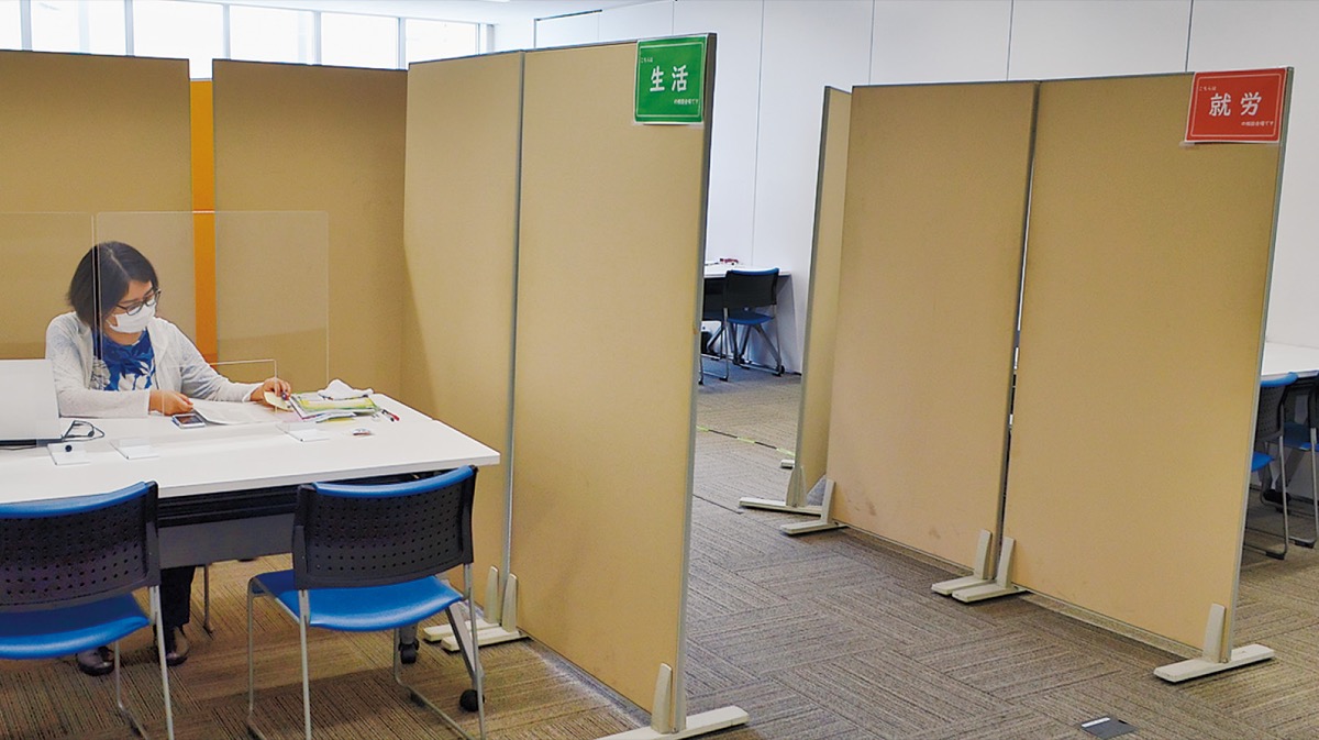 今回の相談会は、現況届受付会場のすぐ隣で実施された。訪れた24人は「就労」「生活」「子育て」の3つの分野について、ひとり親支援団体の相談員などに相談した。