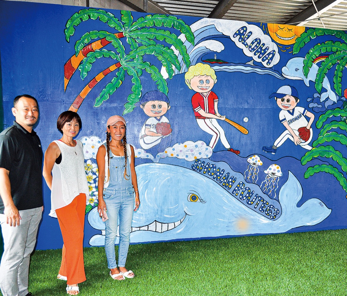烏帽子岩や江の島、ヤシの木を背景に、波上で野球を楽しむ子どもたち―。湘南と野球をモチーフにした壁画アートが、10月にオープンする屋内野球練習場「SHONAN ROUTE 63 野球塾」(本宿町2の32)内に完成した。