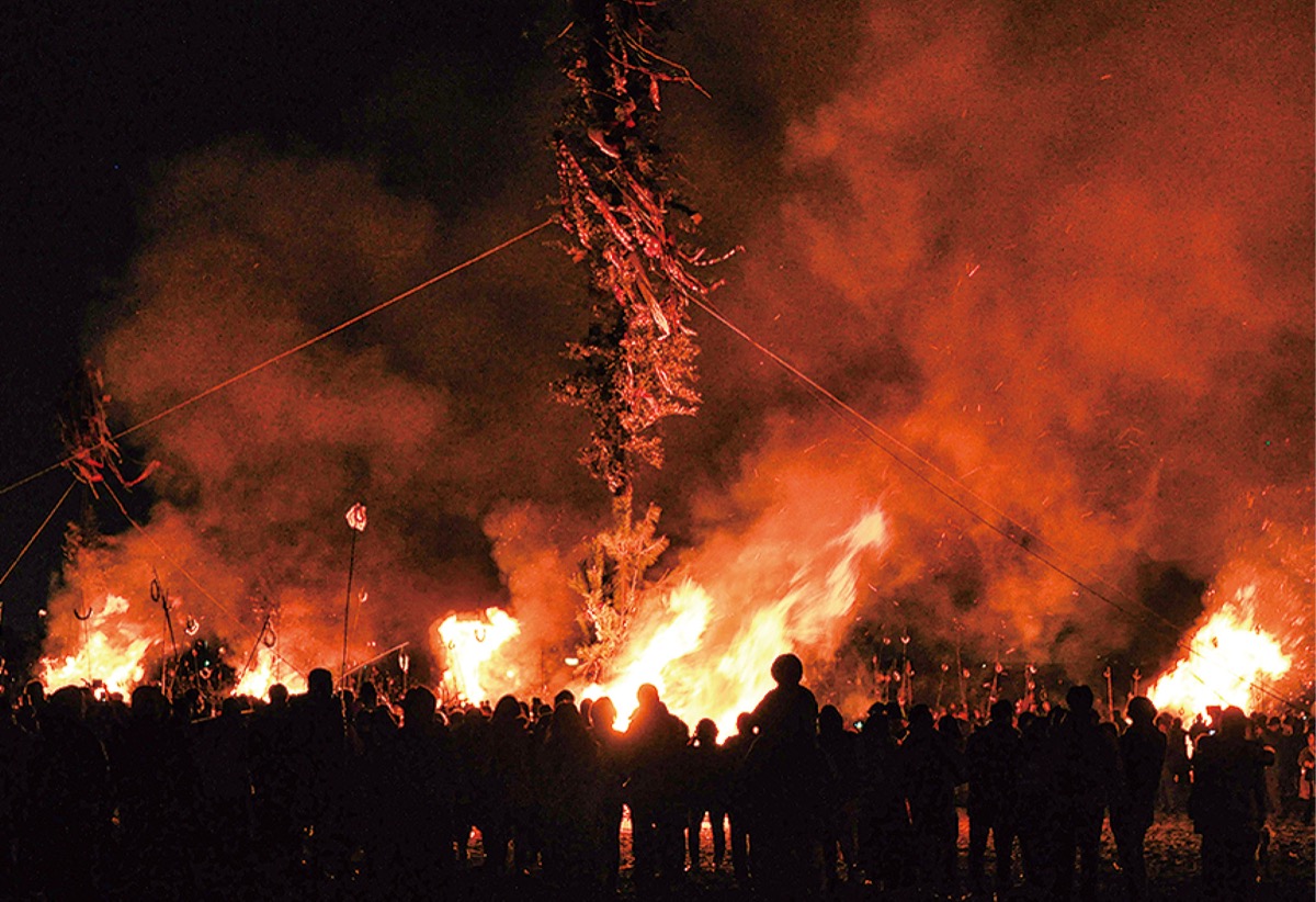 大磯の左義長は、大磯北浜海岸沿いの下町9地区で小正月に行われてきた道祖神の火祭り。海岸に藁や各地区から集まった正月飾りなどを積み上げて高さ7〜8メートルの「サイト」を9基作り、1年の家内安全や無病息災を願って一斉に火をつける「セエトバレエ」の様子は毎年、全国ニュースなどでも取り上げられている。