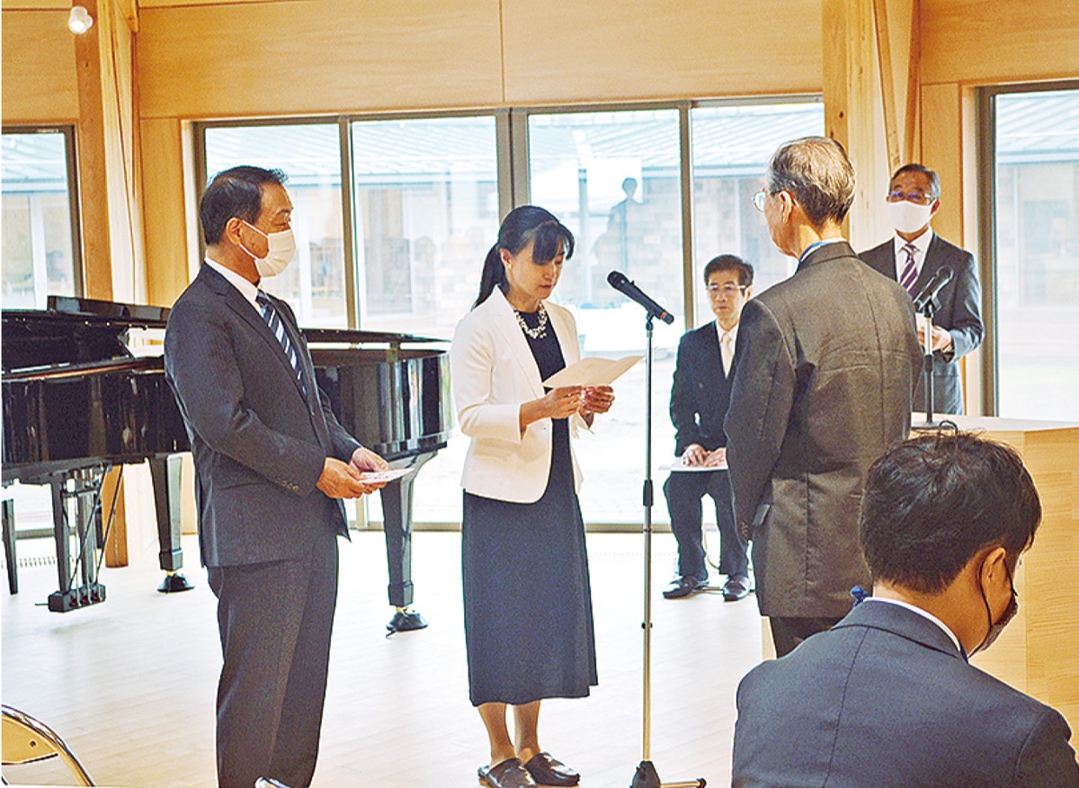 式典では、洋建築企画の清水智津子代表と大勝建設の加藤順一社長に感謝状が贈られ、両社からは同園の教育の場で活用してもらいたいと時計が寄贈された。