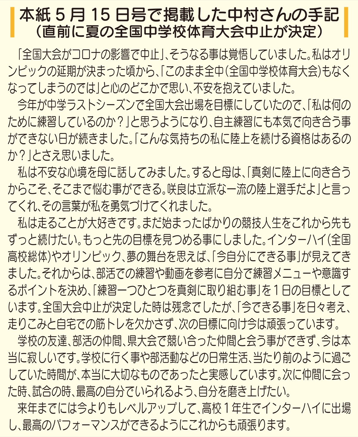 その時の思いを綴った本紙5月15日号の手記=右=で、中村さんはこう述べている。「『私は何のために練習しているのか?』と思うようになり、自主練習にも本気で向き合う事ができない日が続きました」と。そんな心境を母・愛子さん(45)に打ち明けると、「真剣に陸上に向き合うからこそ、そこまで悩む事ができる。咲良は立派な一流の陸上選手だよ」と背中を押してもらった。