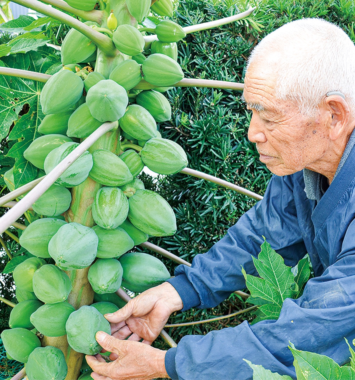 永野さんは地元で70年以上農業を営み、小松菜やルッコラなど約50種の野菜を栽培、小学校で食の教育などの講師も務めている。「青パパイヤの栽培はまだ実験段階だが、今後の方向性については市と協議しながら進めたい。将来的には道の駅などで販売できれば」と永野さんは話す。