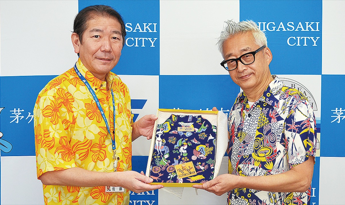 茅ヶ崎市美術館の小川稔館長らが11月4日、市役所を表敬訪問し、アロハシャツブランド「SUN SURF」の製品を寄贈した。