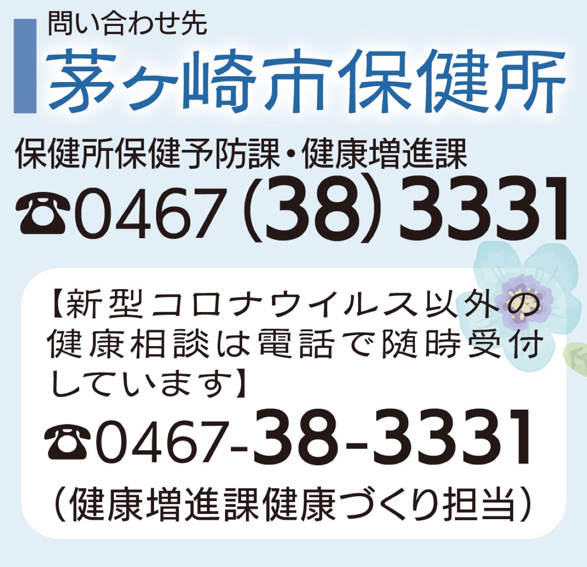 ストレスによりこころに疲れを感じている方が、ひとりで悩みを抱え込まずに気軽に相談できるよう保健所では専門の相談員によるこころの110番(電話相談)を開設しています。相談希望の方は、茅ヶ崎市保健所保健予防課(【電話】0467・38・3315)へご連絡ください。