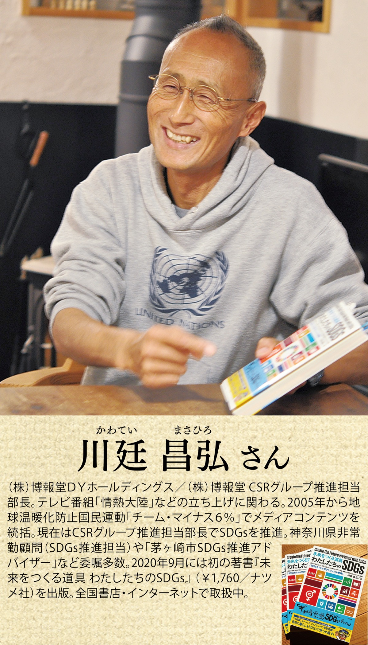茅ヶ崎暮らしは7年、湘南の海辺暮らしは25年以上という川廷さん。(株)博報堂DYホールディングスグループ広報・IR室CSRグループ推進担当部長をはじめ、神奈川県非常勤顧問など、数々の肩書を持ち、「SDGs」推進のために国内外を飛び回っている。