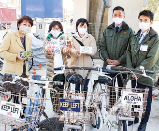 自転車に「KEEP LEFT」のプレートを取り付け、左側通行を心掛けつつ交通安全につなげる「キープレフトプロジェクト」(代表・南八重智子さん)が2月25日、茅ヶ崎市にプレート20枚を寄付した。