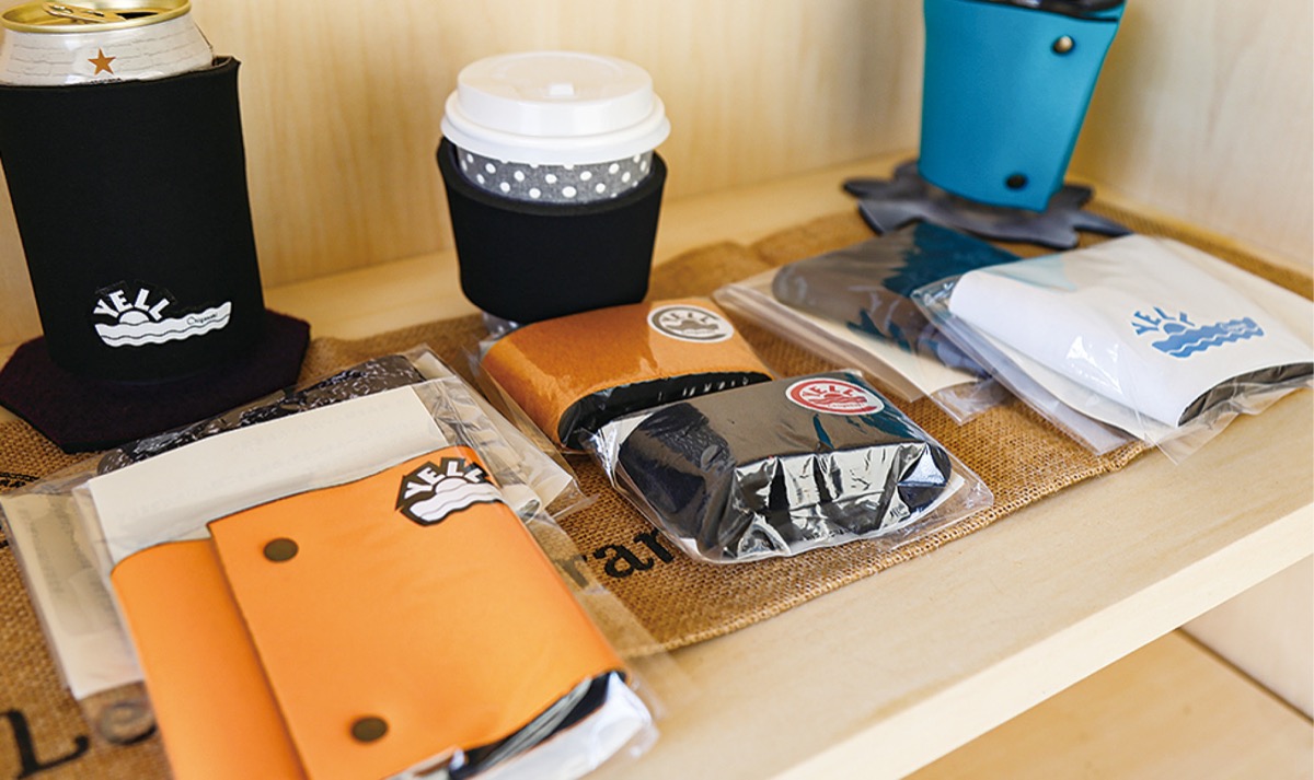 エールちがさきの最大の特徴は、ウェットスーツの素材を使った商品づくりだ。ウェットスーツのメーカーであるヌーベルバーグ・インターナショナル ジャパン(株)(緑が浜)から無償で提供してもらった端材を利用。型紙を当て、カットすることでマウスパッドやチャーム、靴の中敷き、ティッシュケースなどを生み出す。保温性が高いため、コップや缶のカバーも作る。利用者の10代男性は「伸び縮みする素材なので、切るのが難しいが、少しずつ慣れてきた」と笑顔。当初失敗して切れてしまっていたマンタのチャームのしっぽ部分も、最近は上達してきたという。