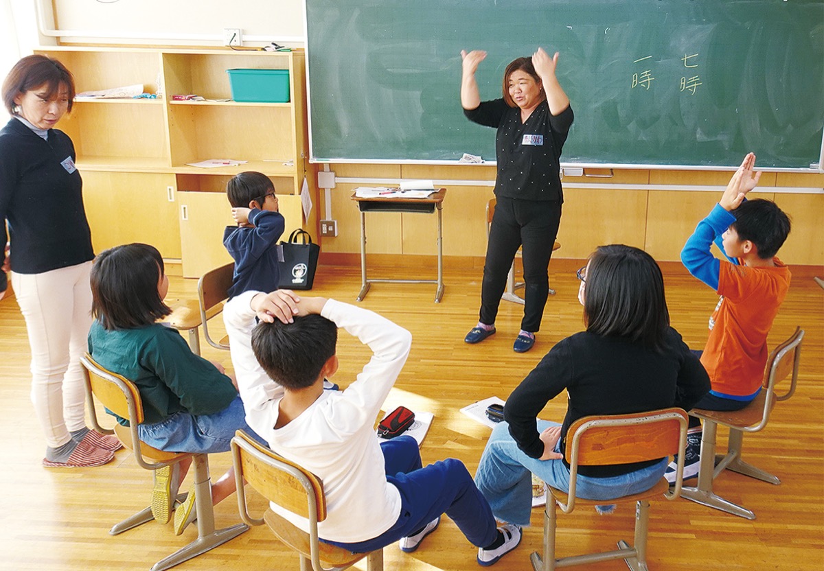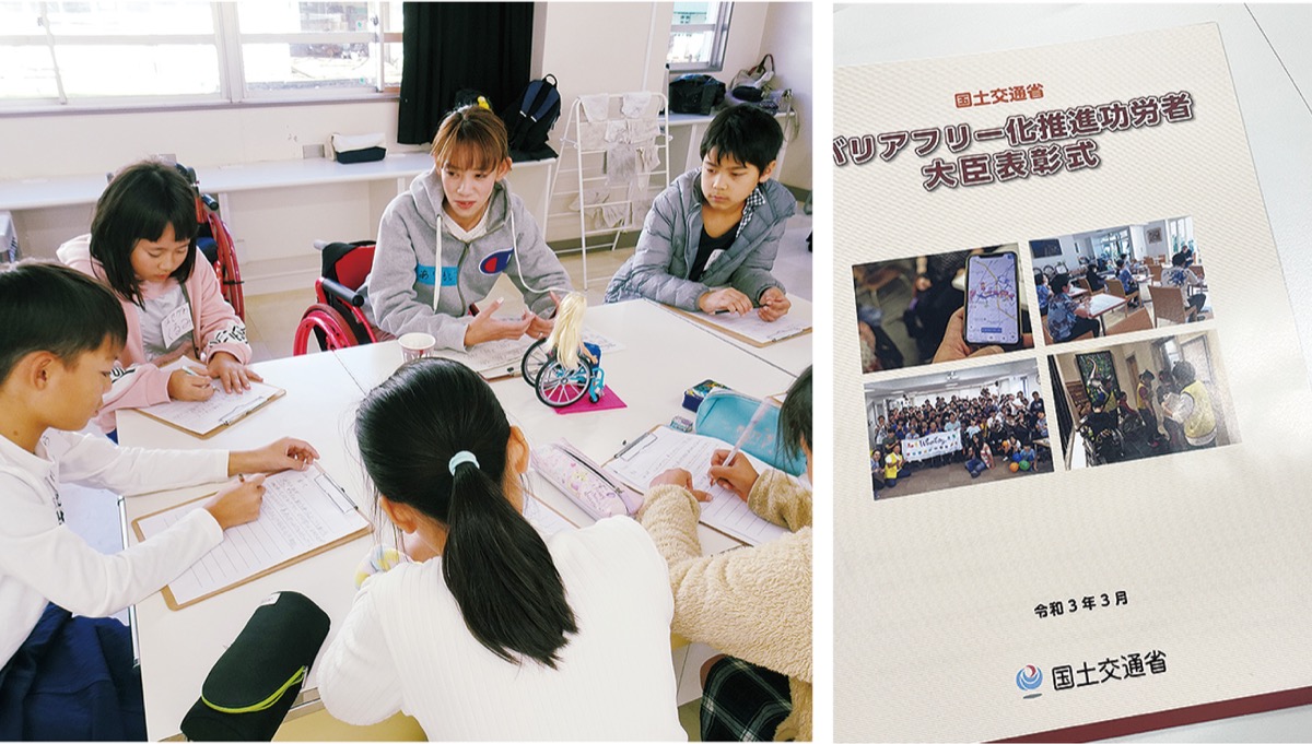 地域活動などのテーマで、県内で初めて国交省のパンフレットに紹介された今回の事例。障がい者の関係団体や市民、学識経験者らで構成する市バリアフリー基本構想推進協議会が中心となり、2019年11月〜20年1月、鶴嶺小の児童たちが視覚障がい者の誘導方法、聴覚障がい者に対する手話での会話を学んだ。また、車椅子の女性を招いて、普段の生活について聞いた。