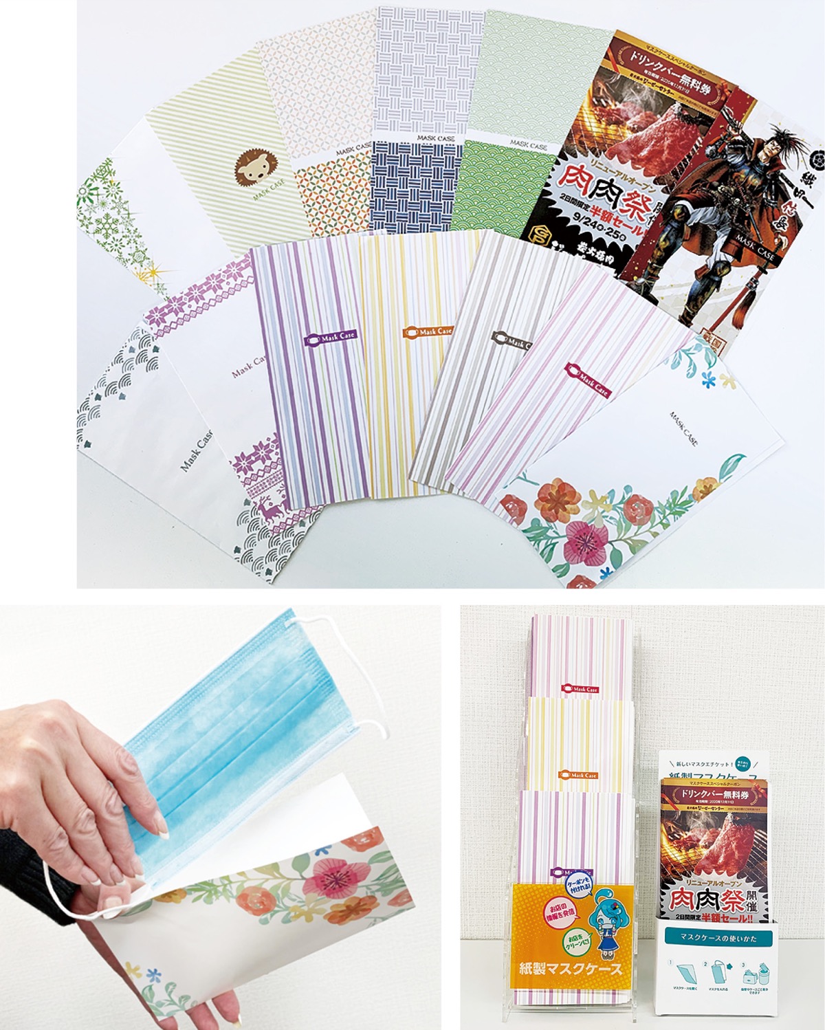 これまでリーフレットを作っていた飲食店が、その代わりとしてテイクアウトメニューやクーポン券を印刷したマスクケースを製作し、店内や店頭で配ったケースも。