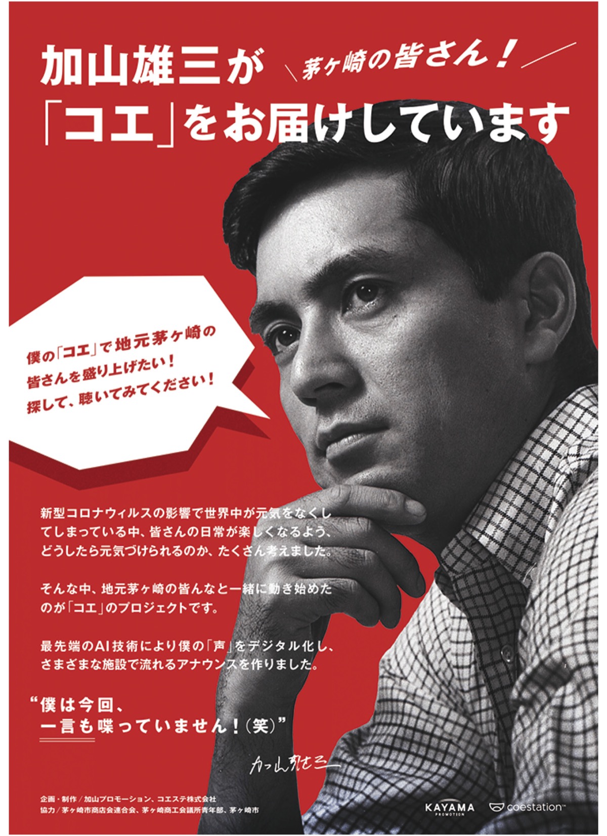 故郷を盛り上げようと企画した加山さんは、「自分でもびっくりするくらい、本当にしゃべっているような仕上がり。僕の『コエ』で茅ヶ崎のみなさんが元気になってもらえたら。街なかでお会いしましょう」とコメントした。