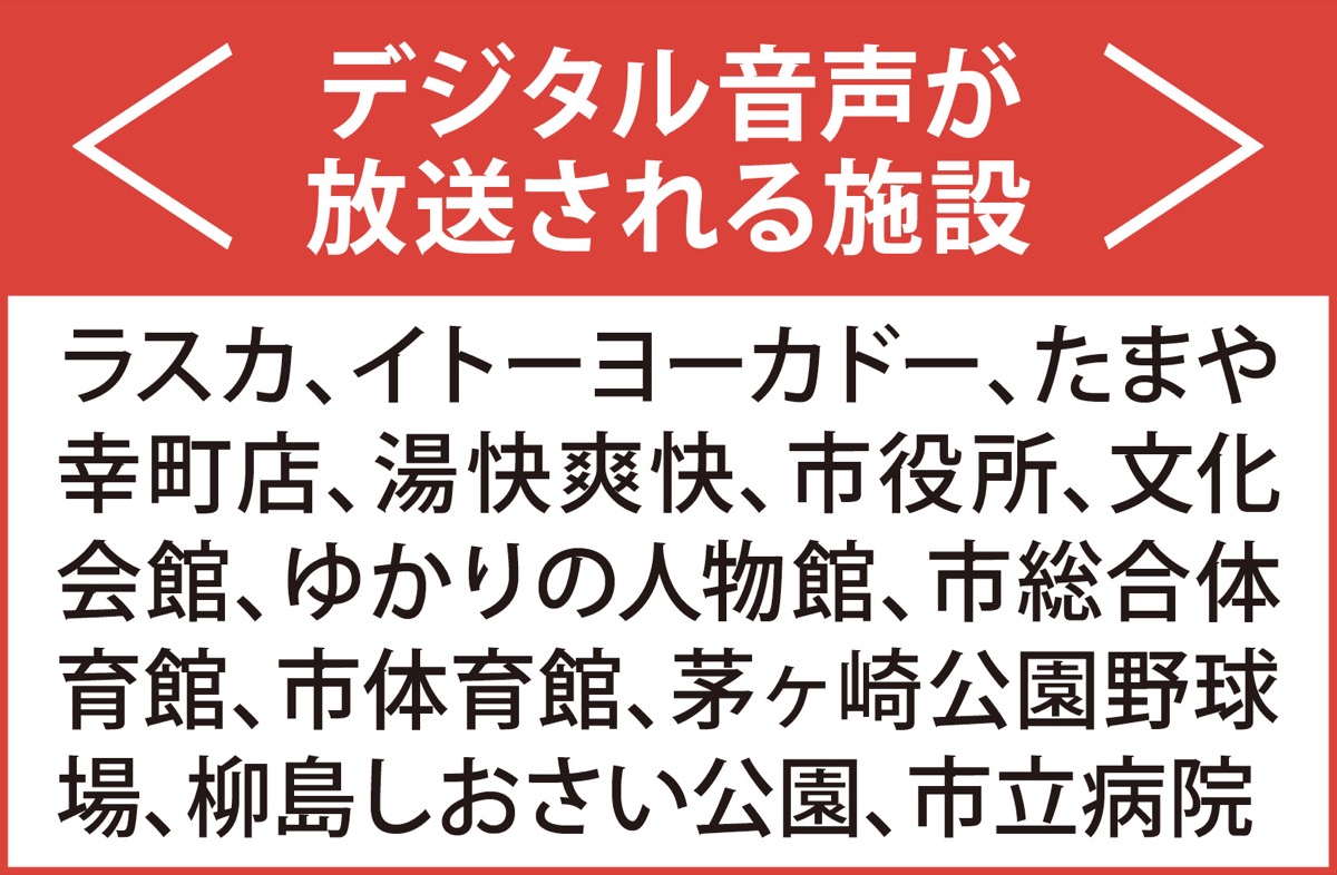 デジタル音声はたまや幸町店のほかに、市内のラスカ、イトーヨーカドー、湯快爽快、市役所、文化会館、ゆかりの人物館、市総合体育館、市体育館、茅ヶ崎公園野球場、柳島しおさい公園、市立病院の館内放送で使用。アナウンスのフレーズは、施設ごとに異なる。