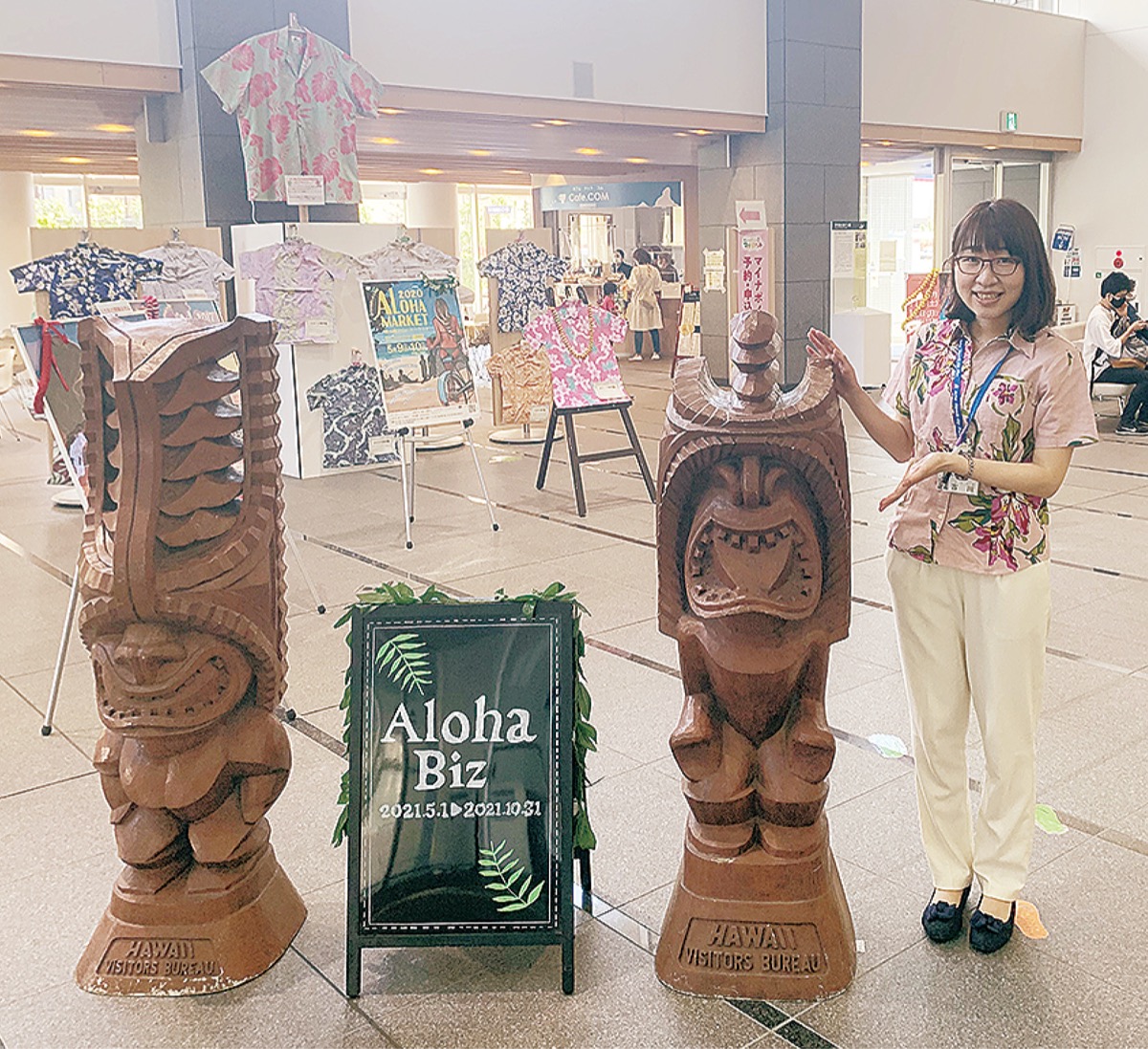 5月1日(土)からの「アロハビズ」に先駆け、4月19日から茅ヶ崎市役所本庁舎1階市民ふれあいプラザで「オープニング企画展」が始まった。ハワイの神の像「ティキ」、えぼし麻呂やサザンCなどがプリントされた20XLのビッグアロハシャツなどが展示され、庁舎に彩りを添えている。展示期間は5月6日(木)まで。