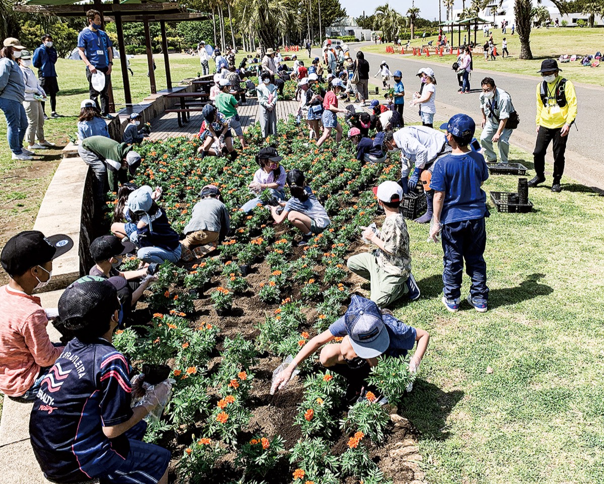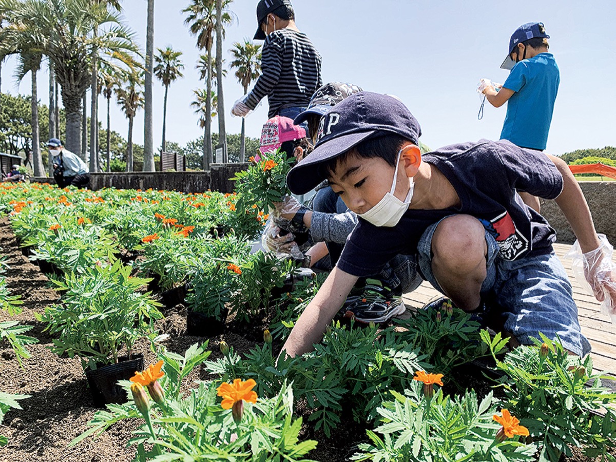 松浪小学校(安倍武雄校長)の3年生児童160人が4月20日、21日の2日間、辻堂海浜公園でマリーゴールドの花苗約2500ポットを植栽した。子どもたちは今後、活動を継続していけるよう、他学年に取り組みの意義を広めていく。
