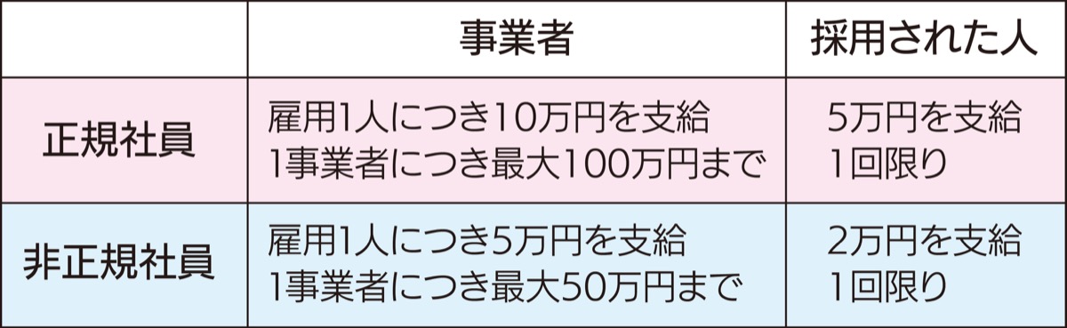 支給金額は正規社員の場合、事業者に対しては雇用1人につき10万円、最大100万円、採用者には1回限り5万円。