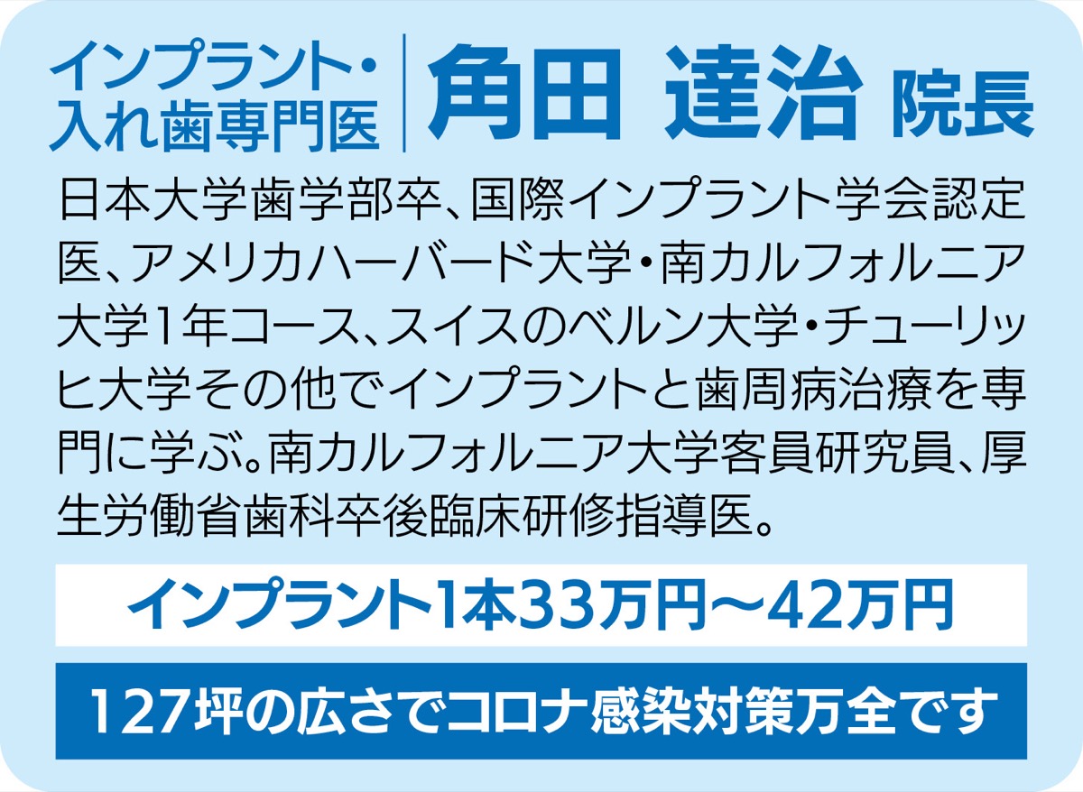 インプラント治療の利点は自分の歯とまったく変わらない機能と審美であること。神奈川県でも屈指の1万本以上の症例数と治療歴32年以上の長い臨床経験を持つ『鵠沼アルカディア歯科・矯正歯科』のインプラント専門医・角田達治院長は、「インプラント成功率99・9%。10年は当たり前、20年から30年持ちます」と話す。また、同院には大学病院の手術室に準じる滅菌の完全隔離されたオペ室があり、全身安全管理モニター・点滴設備・笑気酸素吸引設備・大型医療空気清浄機(除菌)・滅菌機材管理庫・PCガイデッドサージェリー機器など、先進の手術関連機器設備を完備。インプラント手術も通常の埋入手術から骨造成手術(GBR)などの高度な手術も多数手がけている。「インプラントは、世界的インプラントメーカー・スイス『ストローマン社』製を使用しています。インプラント手術とその上の被せ物やインプラント以外の歯の虫歯、歯周病、咬合治療も総合的(包括的)治療を行い、経験豊富なワンドクターで行うことにより、20年、30年持つインプラントが可能なのです」と角田院長は話す。