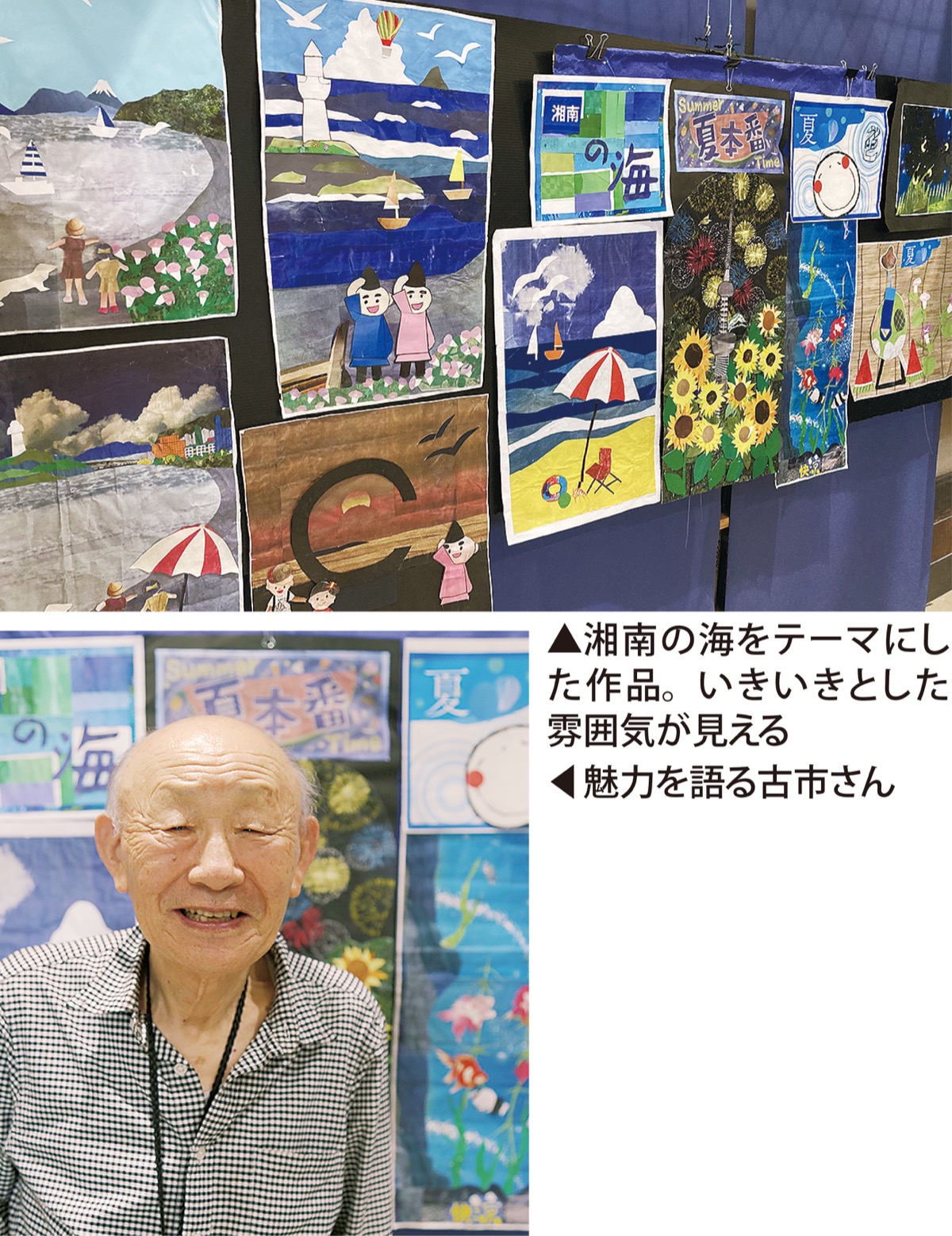 長年千葉県に住み、84歳の頃、妻の入院に伴い茅ヶ崎へ。湘南で得られる海のイメージは、作風の幅を広げているという。千葉県時代は教室を開いており、「コロナが落ち着けば、茅ヶ崎でも開きたい」と古市さん。「古紙が持つ特有の彩りや、創作することの魅力を共有できれば」とニッコリ笑った。