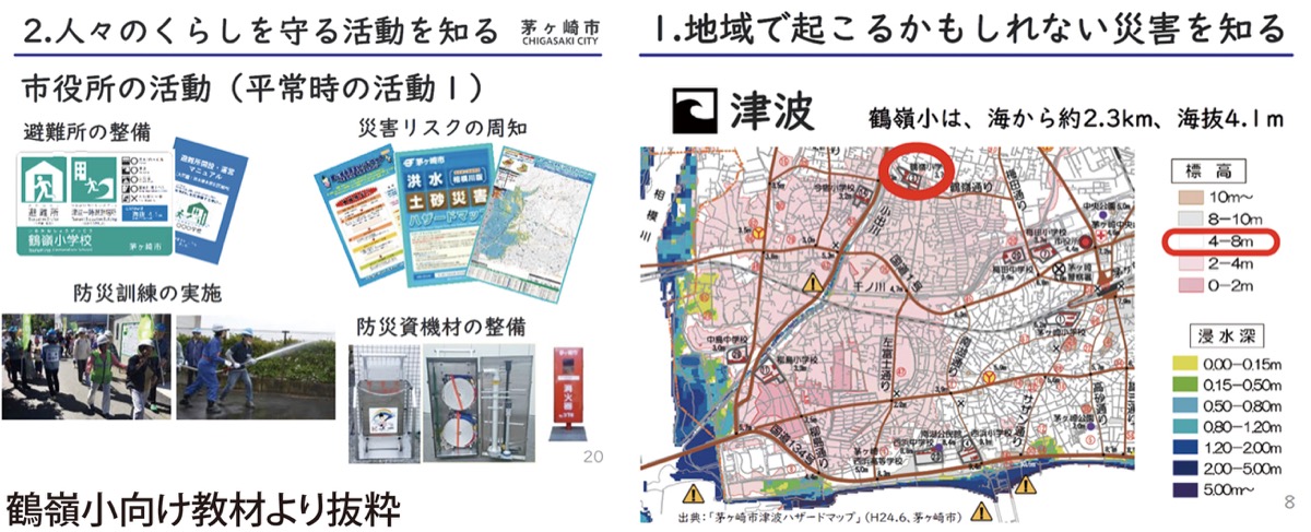 鶴嶺小向けの教材は、「津波・川の氾濫・大規模な火事」をピックアップ。イラストや写真を多用し子どもでも分かりやすい内容で、教諭用には授業の進め方のアドバイス等も記されていた。