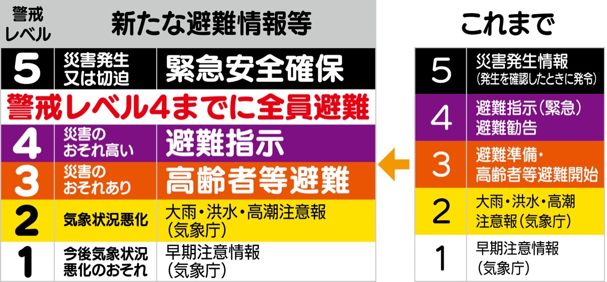 風水害の際に市区町村が出す避難情報は、今年5月から変更となっている(右下図参照)。「ガイドBOOK」では、警戒レベル3か4のどちらで避難を開始するか「逃げどき」をまず決める必要性を説明している。なおレベル5は、災害発生中または直前の状況であるため、レベル3・4の時点で速やかに避難を開始することが重要だ。