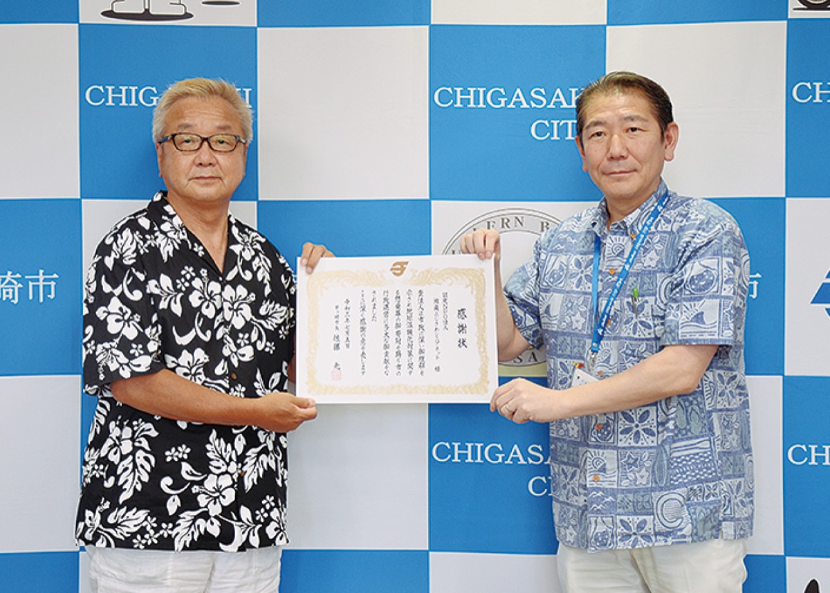 贈呈式には、シニアネットの山本代表理事、前代表理事の小林信武さん、同会環境グループのリーダーである内藤貞人さんが出席、佐藤光茅ヶ崎市長から感謝状が手渡された。